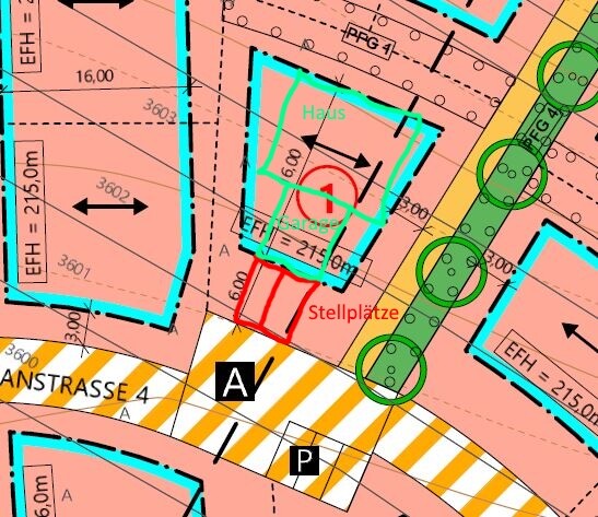 Von wo fährt man rauf? Von Süden? Die roten Dinger sind die Stellplätze bzw die Auffahrt? Und woran soll man jetzt den Unterschied von Auffahrt zu Stellplätzen ausmachen?