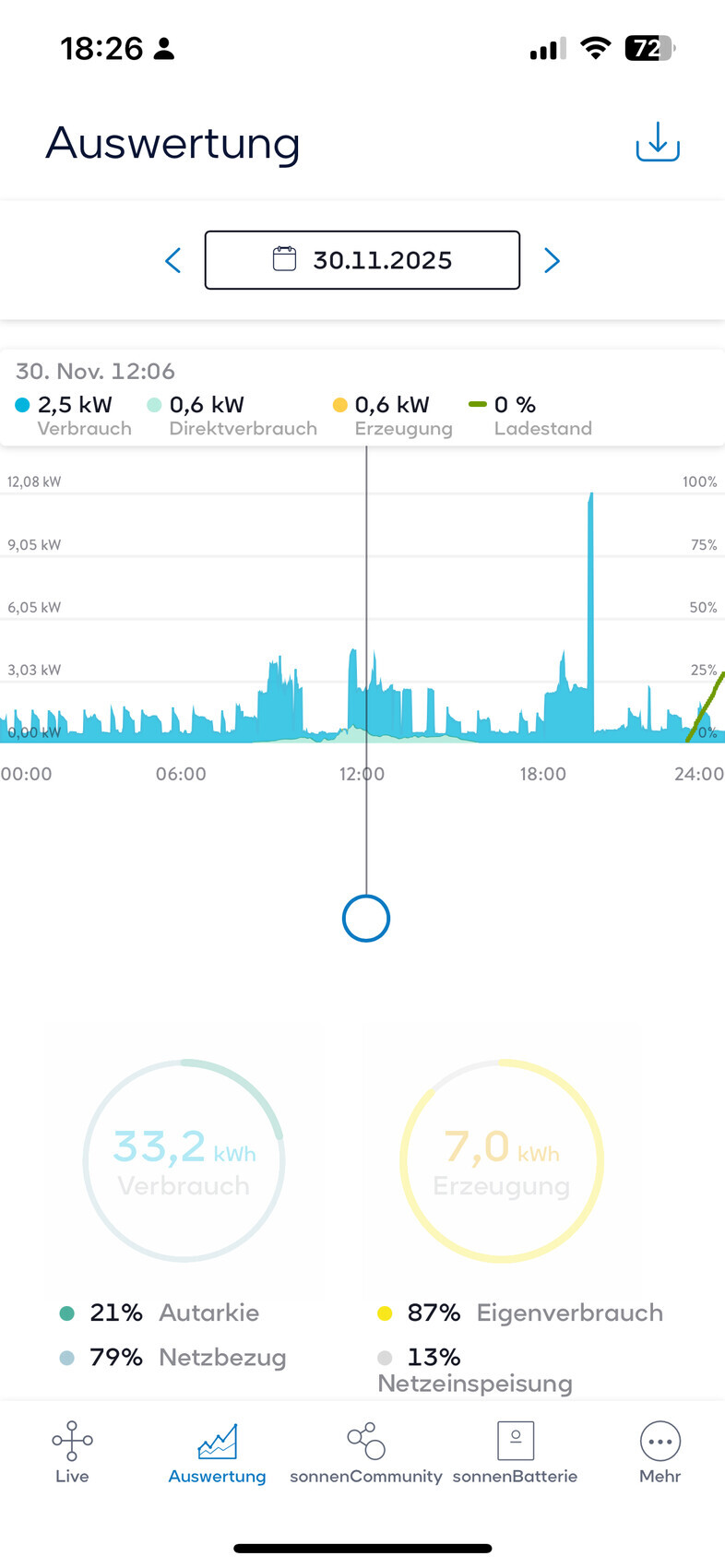 Energiemonitoring-App zeigt Verbrauch, Erzeugung und Graphen mit Datum 30.11.2025.