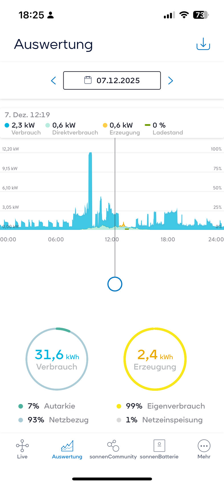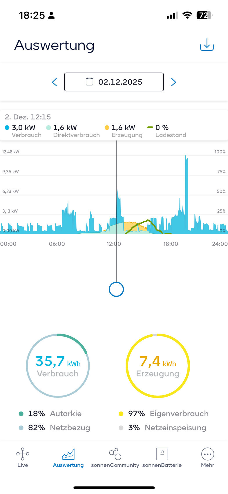 Screenshot einer Energiestatistik-App mit Verbrauch, Erzeugung und Autarkie-Diagramm