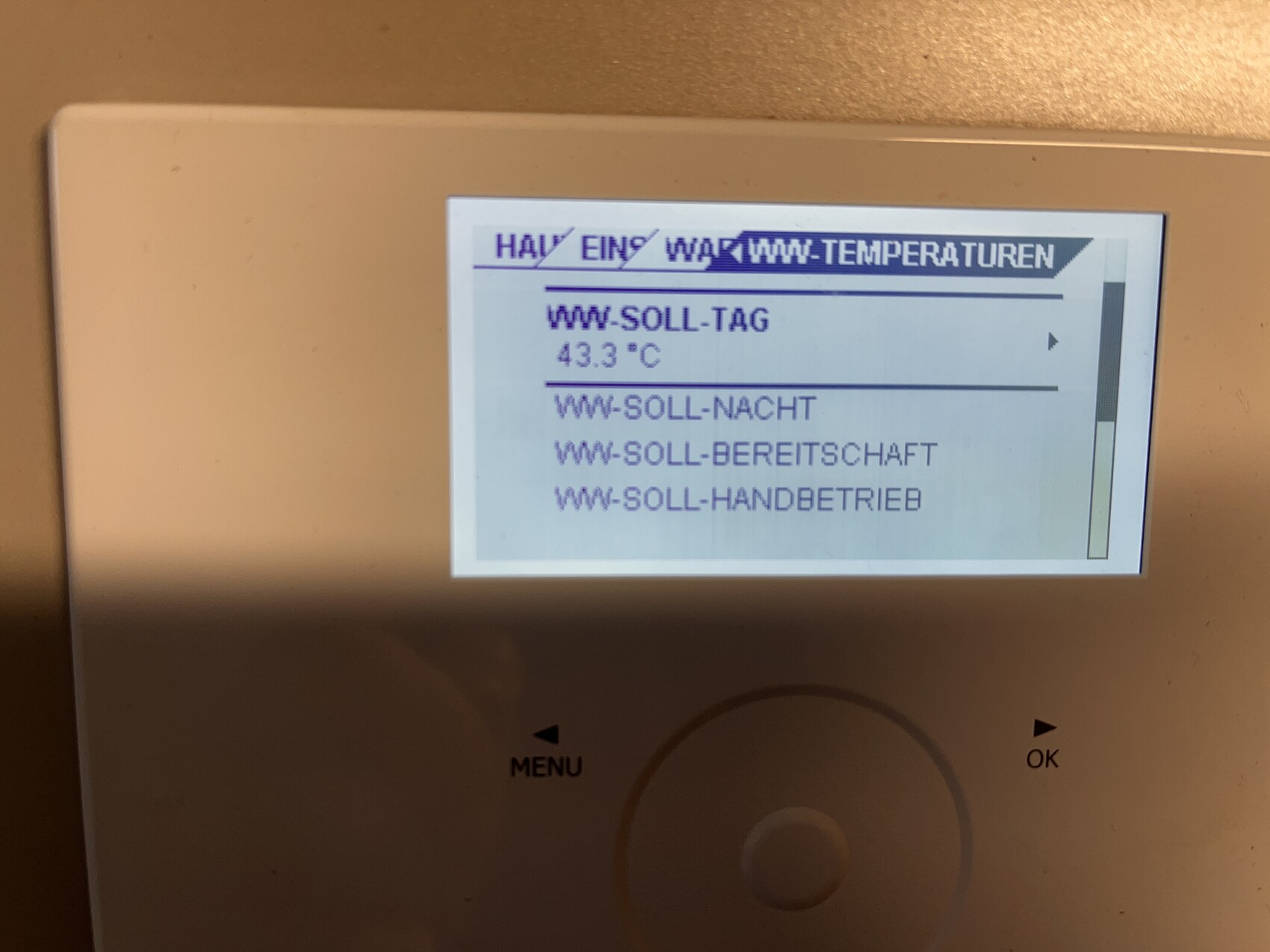 Display einer Heizungssteuerung mit Außentemperatur und Heizwerten.