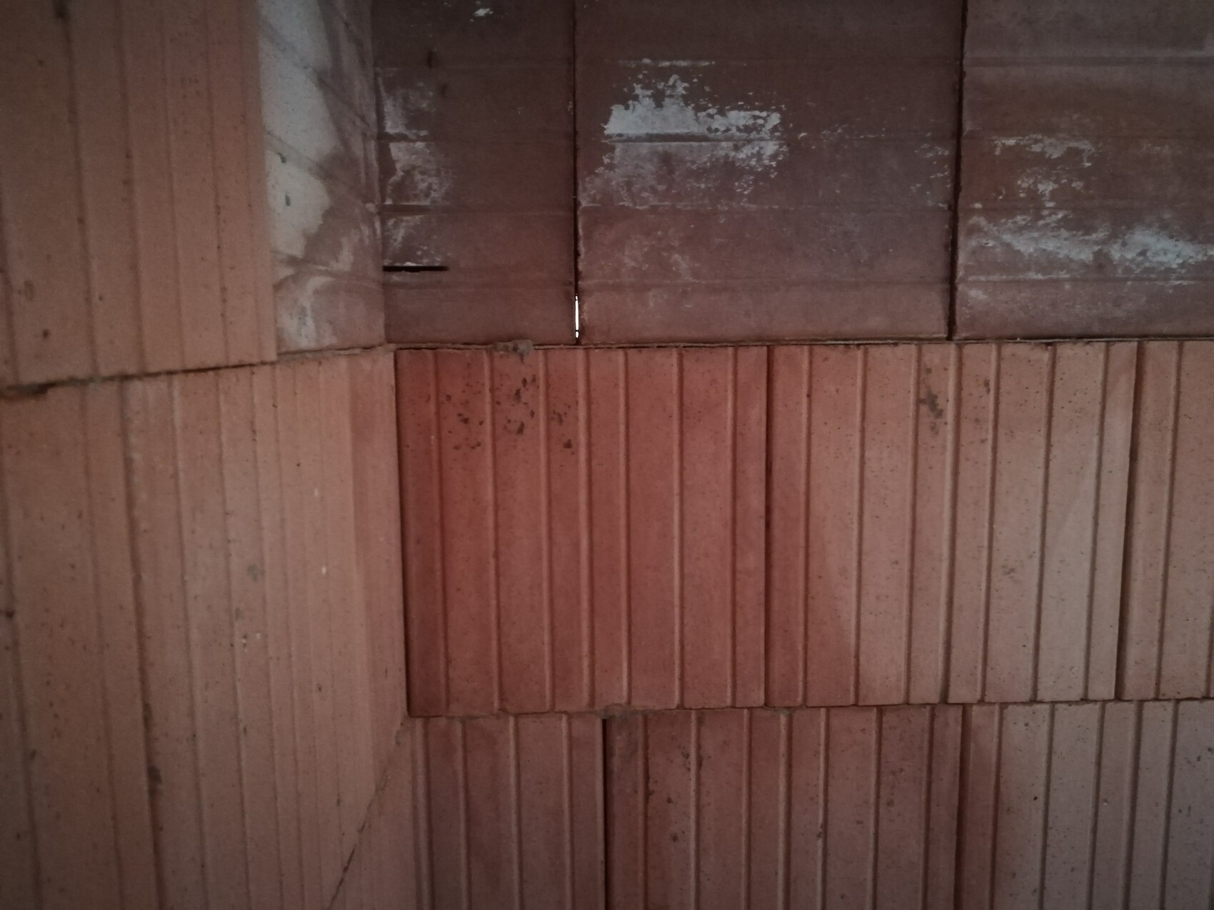 Mir ist aufgefallen, dass fast alle Lücken in einer Ziegelreihe entstanden sind, welche "anders" aussieht (dunklere Steine, sieht so aus als ob es dort keine Nut geben würde, sondern diese mit einer flachen Fläche an die nächste gelegt wurden, kann das eine Art Sperrschicht sein?)