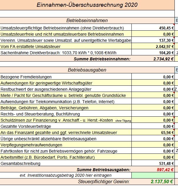 Dafür muss ich trotzdem jeden Monat eine Umsatzsteuervoranmeldung machen. Man bezahlt die Umsatzsteuer auf die Einspeisevergütung und dann auch noch eine unentgeltliche Wertabgabe auf den Direktverbrauch.