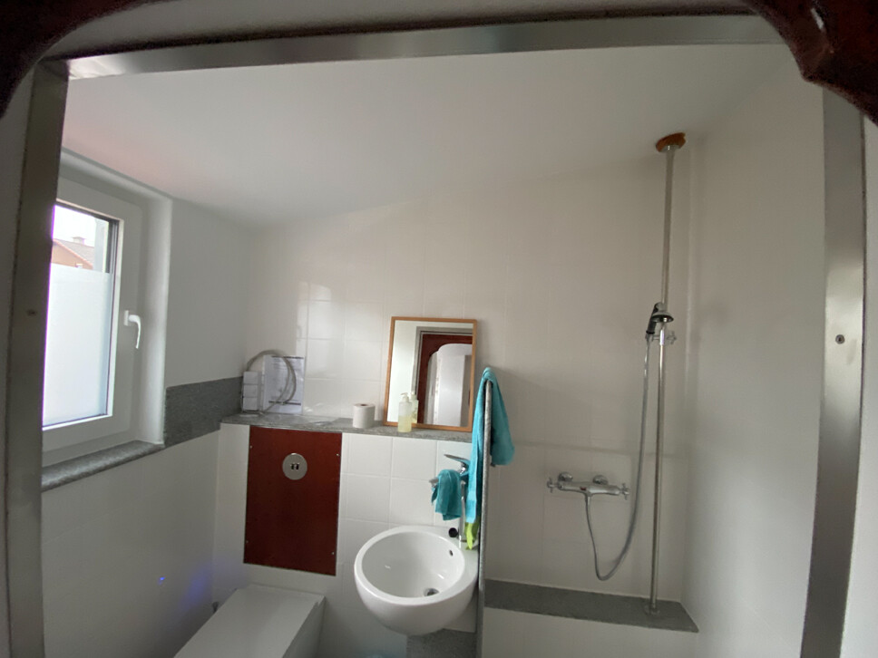 Links neben das Fenster kommt ein Badschrank über die Steckdosen. Wo der Spiegel steht, kommt ein Spiegel hin (bis ganz nach oben) .