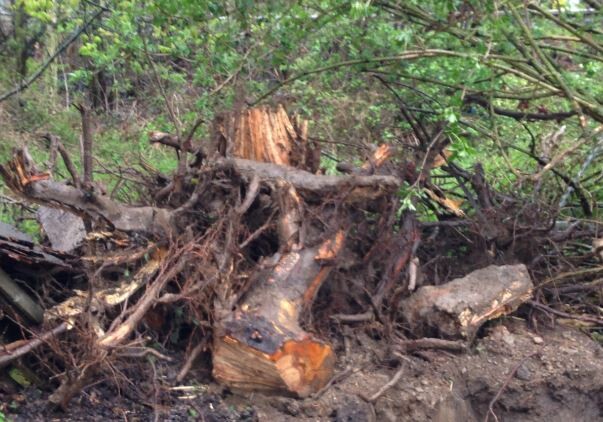 Ein großer Eichenstubben wurde dann im Rahmen der Erdarbeiten entfernt und da kam der große Bagger des Erdbauers echt in Schwierigkeiten, da der Stubben unter der Erde größer war als gedacht.