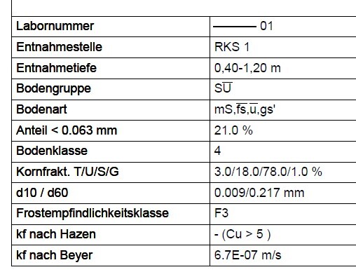 Geotechnische Bodenuntersuchung: Labor 01, Entnahmestelle RKS 1, Tiefe 0,40-1,20 m Bodenklasse 4.
