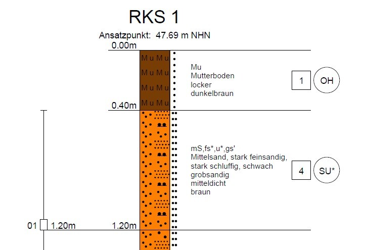 RKS 2: vertikaler Kanal mit orangefarbener Füllung A und Legende zu Bodenarten.