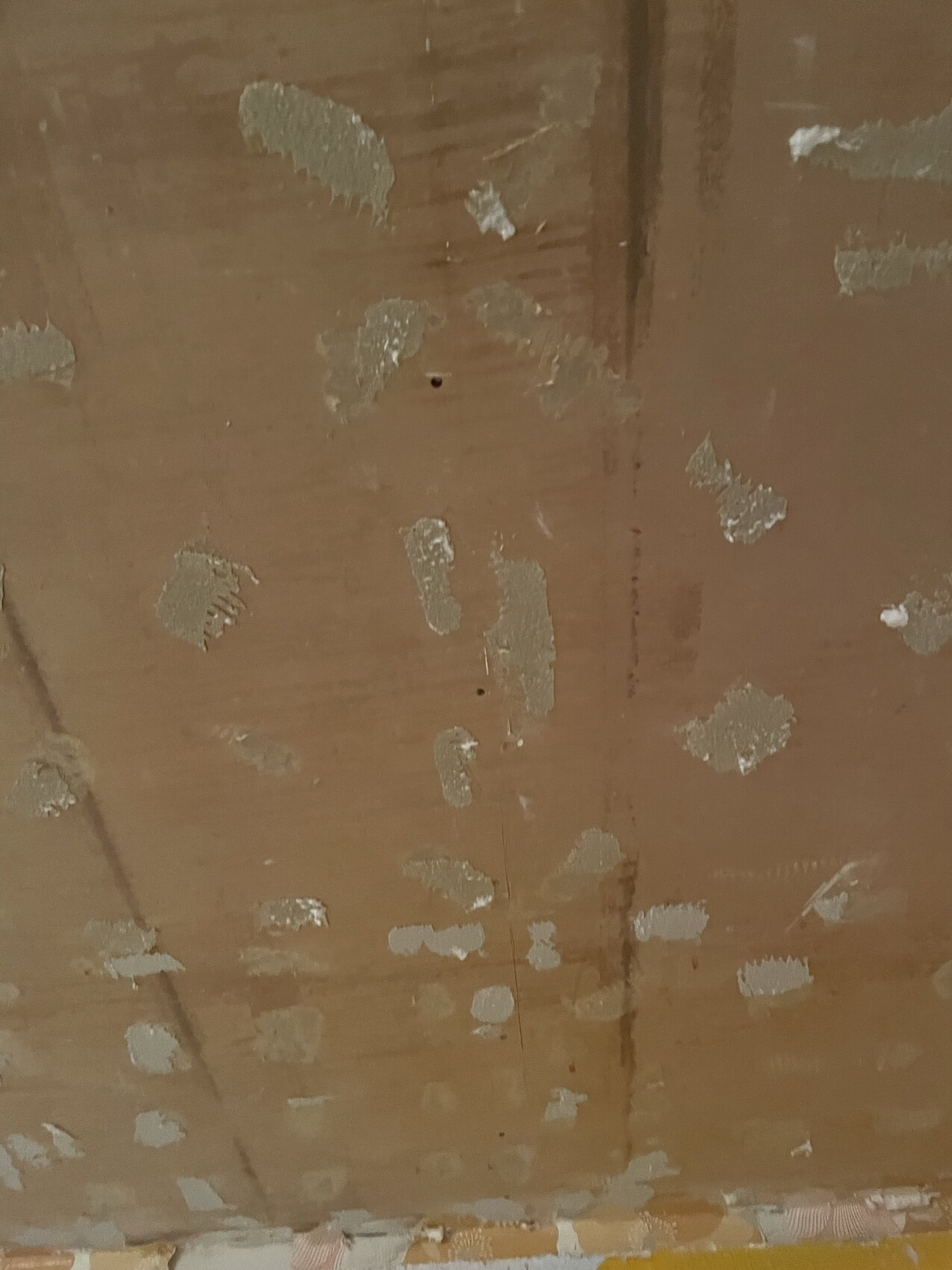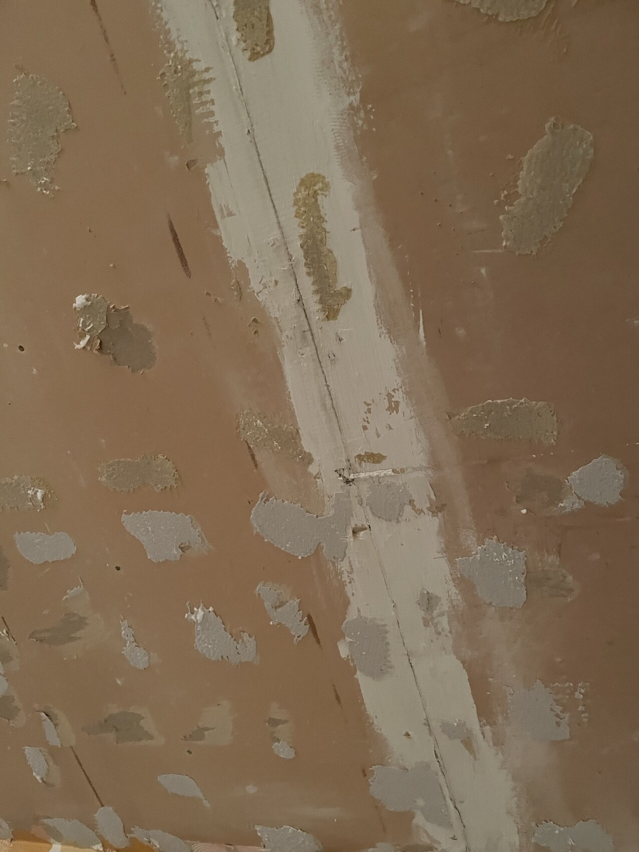 Nahaufnahme brauner Wand/Decke mit abgeplatzter Farbe, grauen Spachtelstellen und weißem Streifen.