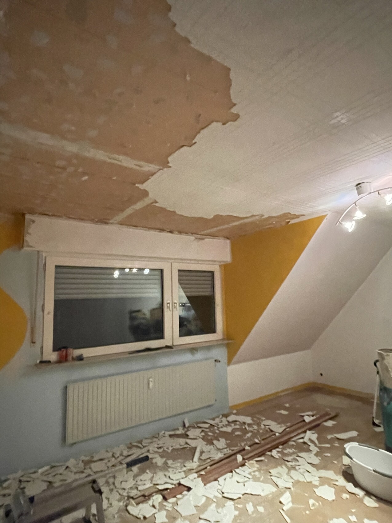 Decke bröckelt, Putz fällt ab; Schutt auf dem Boden, Fenster mit Heizkörper darunter.