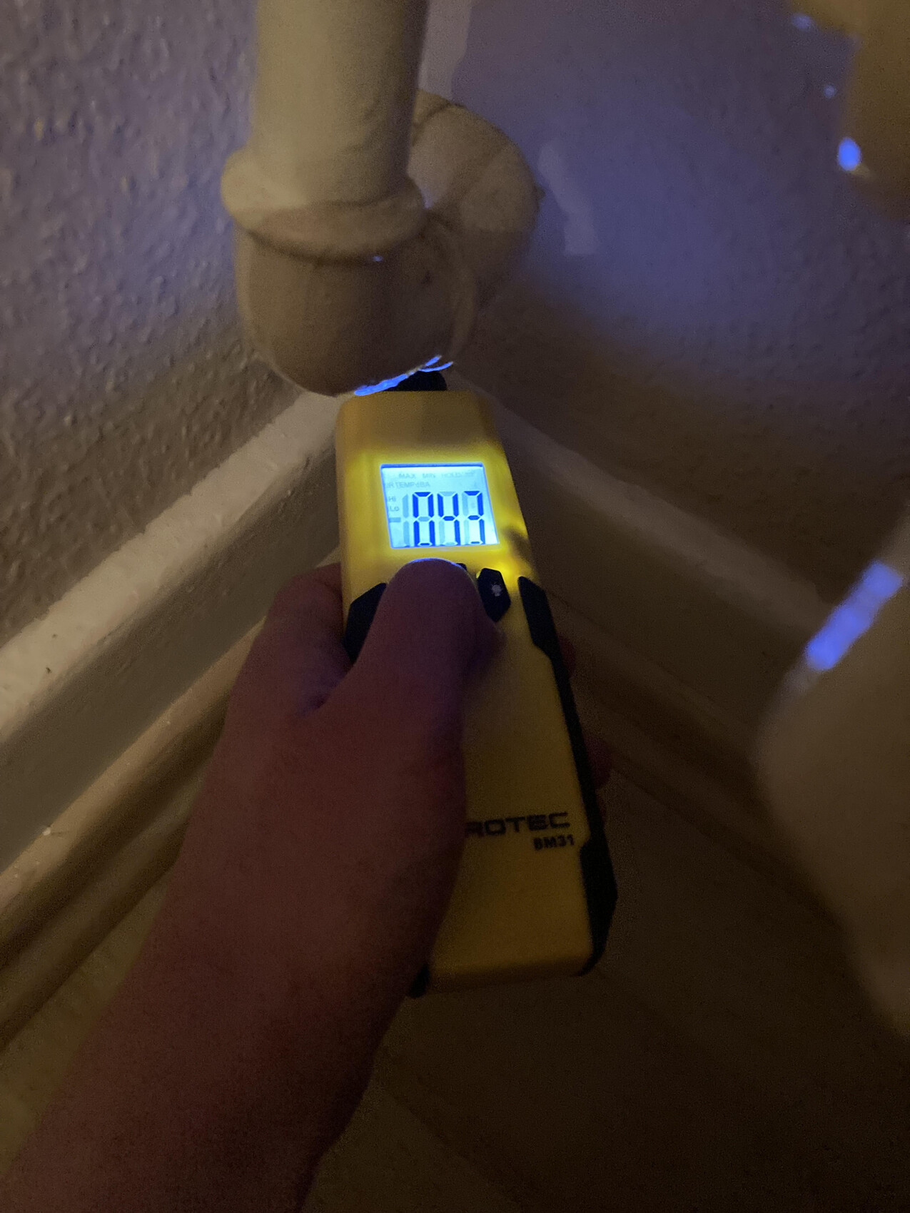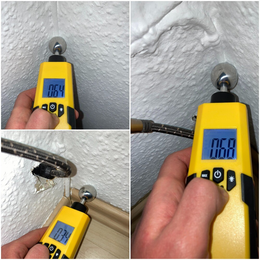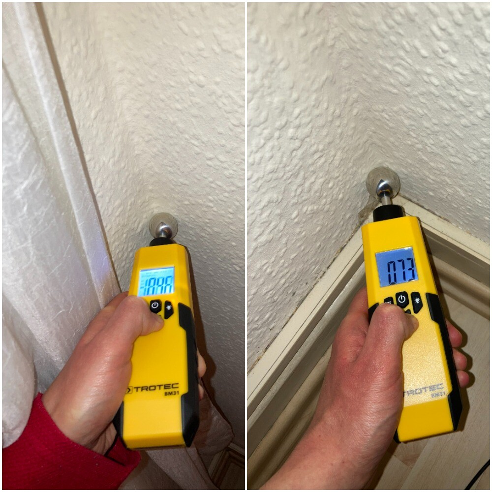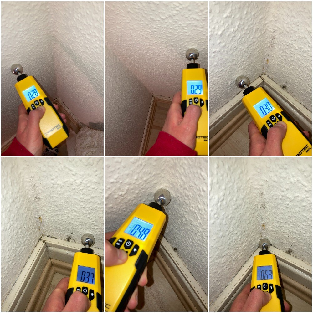 Ich habe mir Mühe gegeben und einige Messungen vorgenommen, und zwar die Feuchtigkeit und die Wärmebrückeermittlung. Bei der Interpretation bräuchte ich auf jeden Fall eure Hilfe. Für die Feuchtigkeitsmessung habe ich TROTEC BM31 genutzt, das die Feuchtigkeit nicht in %, sondern in einheitslosen Digit Werten angezeigt. In der Schimmelecke ist die Feuchtigkeit nur an einer Stelle sehr hoch, und zwar gerade in der Ecke. Am höchsten ist die Feuchtigkeit in der Ecke desselben Zimmers (Schlafzimmer) derselben Außenwand, aber da wo es keinen Schimmel gibt (kommt noch aber eventuell vielleicht?).