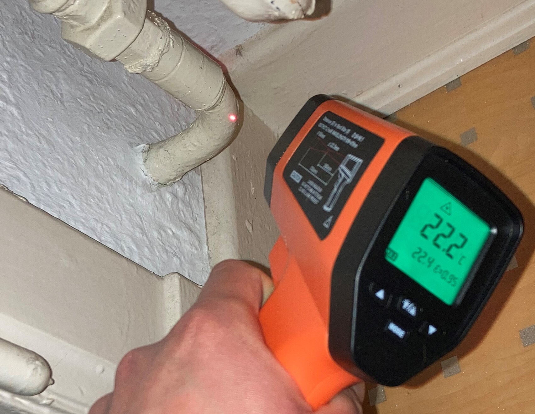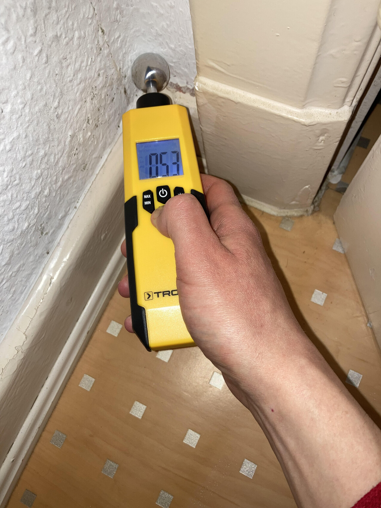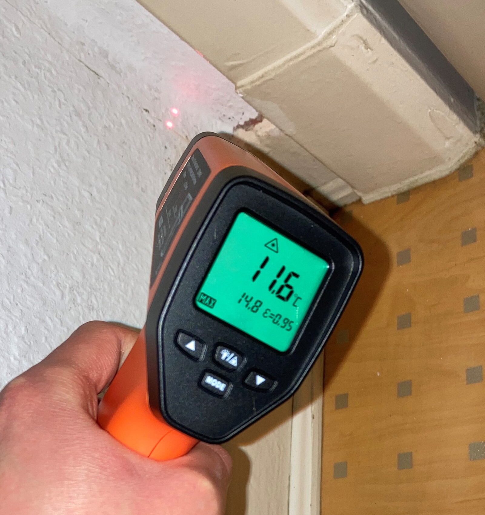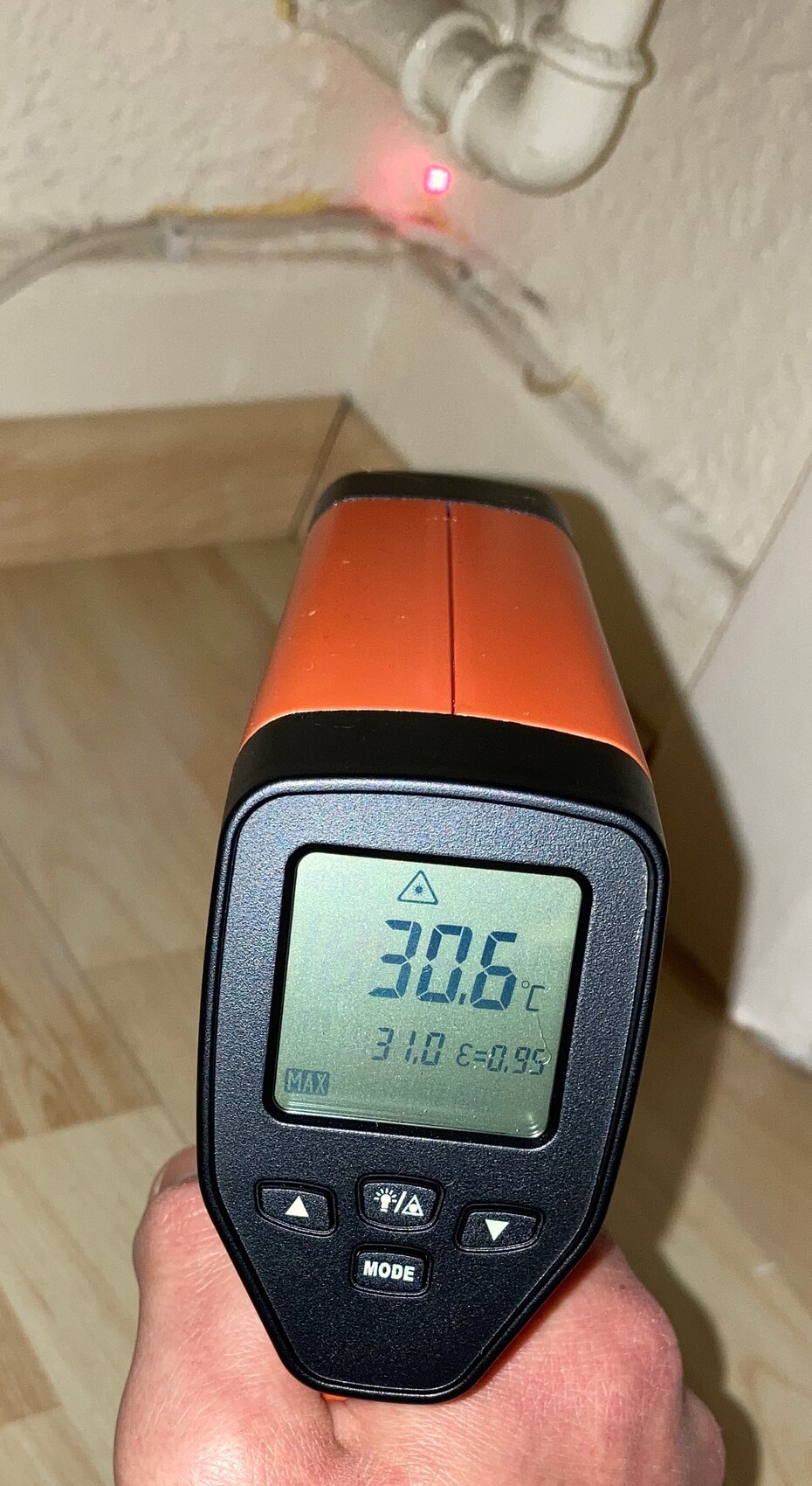Ich habe mir Mühe gegeben und einige Messungen vorgenommen, und zwar die Feuchtigkeit und die Wärmebrückeermittlung. Bei der Interpretation bräuchte ich auf jeden Fall eure Hilfe. Für die Feuchtigkeitsmessung habe ich TROTEC BM31 genutzt, das die Feuchtigkeit nicht in %, sondern in einheitslosen Digit Werten angezeigt. In der Schimmelecke ist die Feuchtigkeit nur an einer Stelle sehr hoch, und zwar gerade in der Ecke. Am höchsten ist die Feuchtigkeit in der Ecke desselben Zimmers (Schlafzimmer) derselben Außenwand, aber da wo es keinen Schimmel gibt (kommt noch aber eventuell vielleicht?).