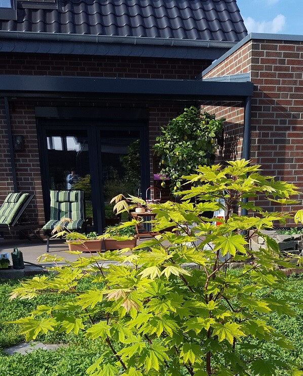 Terrasse eines Hauses mit Glas-Schiebetür; grün-gelber Ahorn im Vordergrund.
