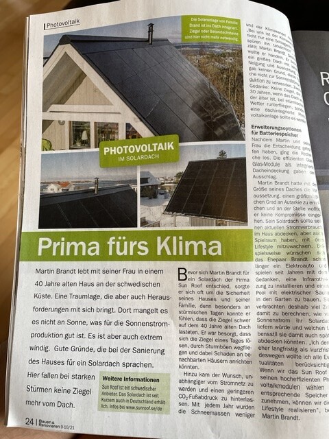 würde ich doch ziemlich sicher sagen, dass das davon abhängt, was Du bestellst, bzw. welche Dachausrichtung und -neigung man hat.Absolut klar, aber wenn man sich den First auf dem Bild anschaut, scheint das nichts „normales“ zu sein. Daher interessiert mich, ob und wie ein Dach ohne Photovoltaik dann aussieht. Ein normaler Dachdecker wird ja sicherlich nicht ein halbes Dach machen, wenn die andere Hälfte von Sun Roof kommt. Oder aber man knallt einfach überall Photovoltaik drauf und hat eine saubere Optik, unabhängig vom Nutzen :-)Ähnliche Themen