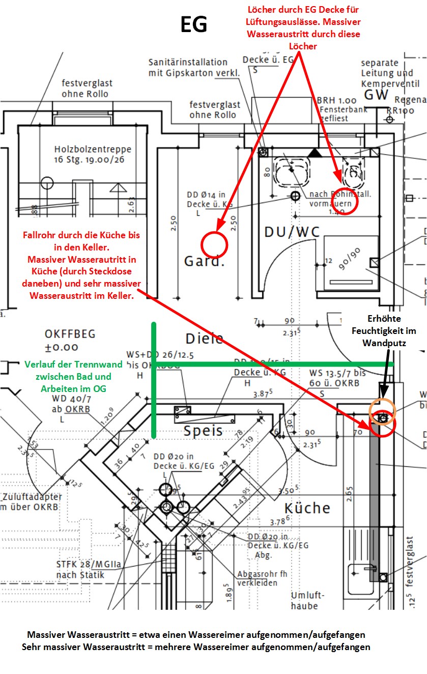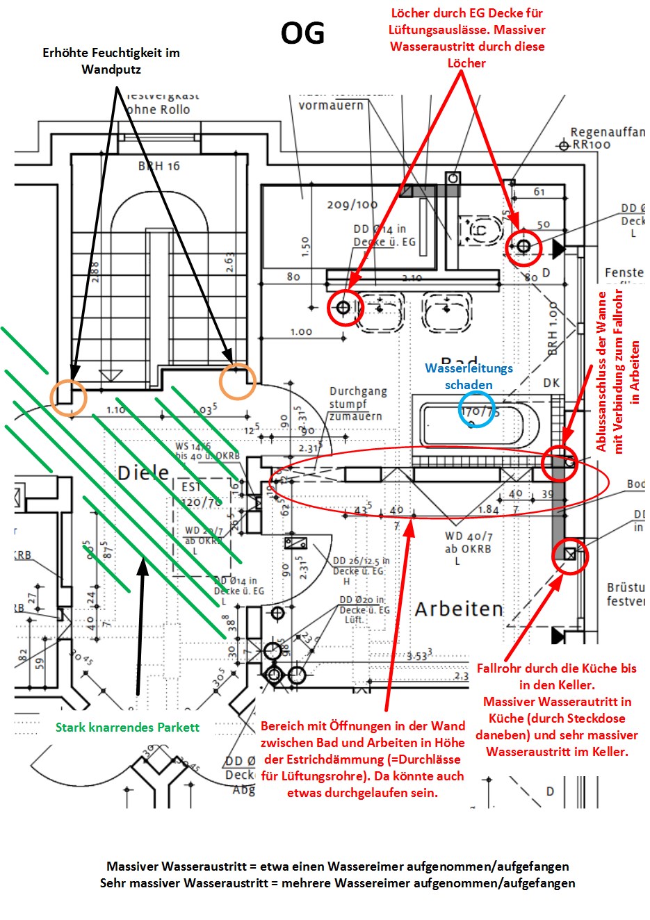 Bitter sind das OG, da ist die Estrichdämmung großflächig nass und ggf.. das EG, weil das Wasser entlang des Fallrohres durch die Kellerdecke (=EG Boden) in den Keller gelaufen ist. Da weiß nun niemand ob das Wasser komplett runter in den Keller ist oder welcher Anteil sich in den Estrichaufbau des EGs versteckt hat.