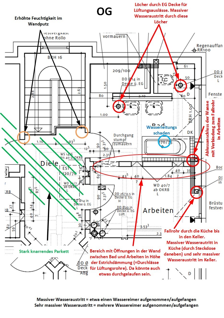 habe mir mal die Mühe gemacht und die offensichtlichen Schadensbilder in den Plänen eingetragen. Da komme ich zurückhaltend geschätzt auf locker 30-40 qm, in denen der Boden feucht sein dürfte.