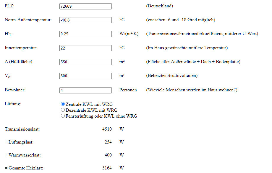 Formular zur Heizlastberechnung eines Gebäudes mit Transmissions-, Lüftungs- und Warmwasserlast.