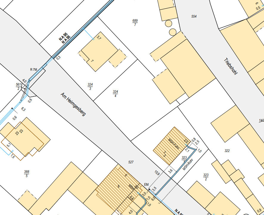 Bei unserer Anfrage war das Problem der Stadtwerke bereits bekannt, da die Hausbeseitzer Grundstück 323/1 bei der Erschließung wohl Probleme hatten. Welche genau weiß ich nicht, da aber die Straße am Heimgesberg eine Ein und Ausfahrtsstraße der Gemeinde zur Bundesstraße hin ist und dort keine Leitungen drin liegen ist wohl nicht üblich. Ich vermute dass die Hausbesitzer (Grundstück 323/1) vor ein paar Jahren beim Bau damals überrascht worden sind und sich mit dem Thema vorher nicht genauer beschäftigt haben.