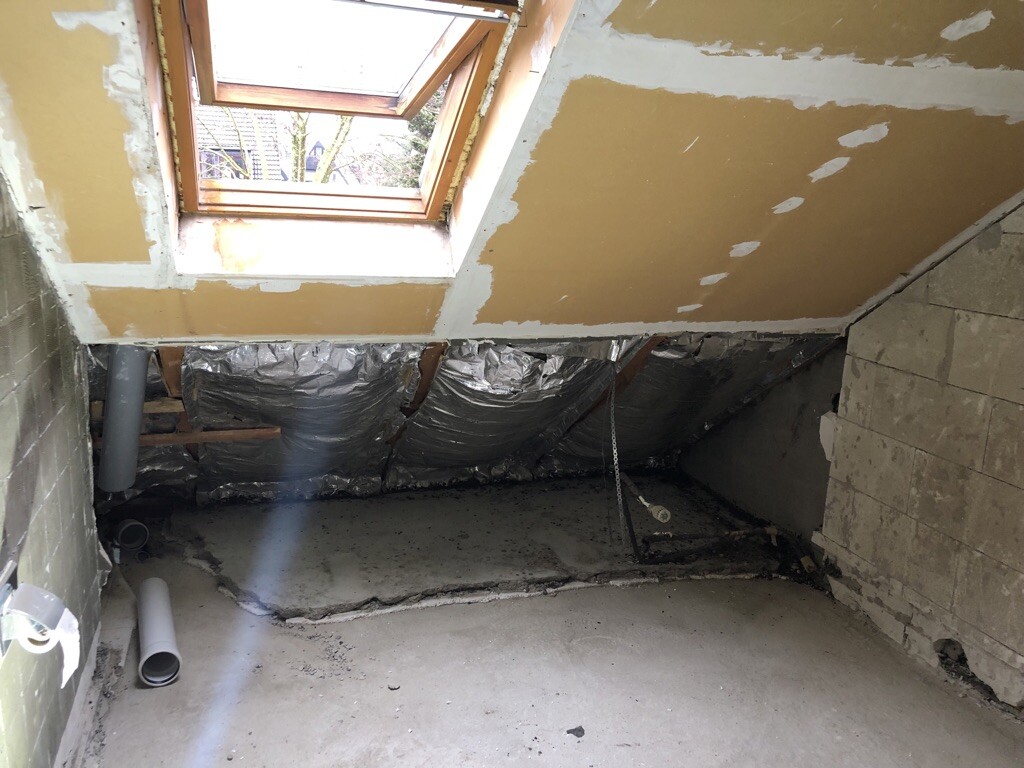 Auf der gegenüberliegenden Seite ist das Kinderzimmer, in das ich ein Veluxfenster einbauen lassen werde...hier stellt sich natürlich auch die Frage, ob ich nicht gleich die Dachschräge auch neu dämme, da die Hälfte der Schräge ja eh schon offen ist für den Einbau des Fensters. Das hätte aber zur Folge, dass ich auch den Drempel, der aus Ytong ist, abbauen müsste um in den Kniestock des Daches zu kommen. Das ist mir ehrlich gesagt zu viel Aufwand, weil es noch so viele andere Baustellen gibt.