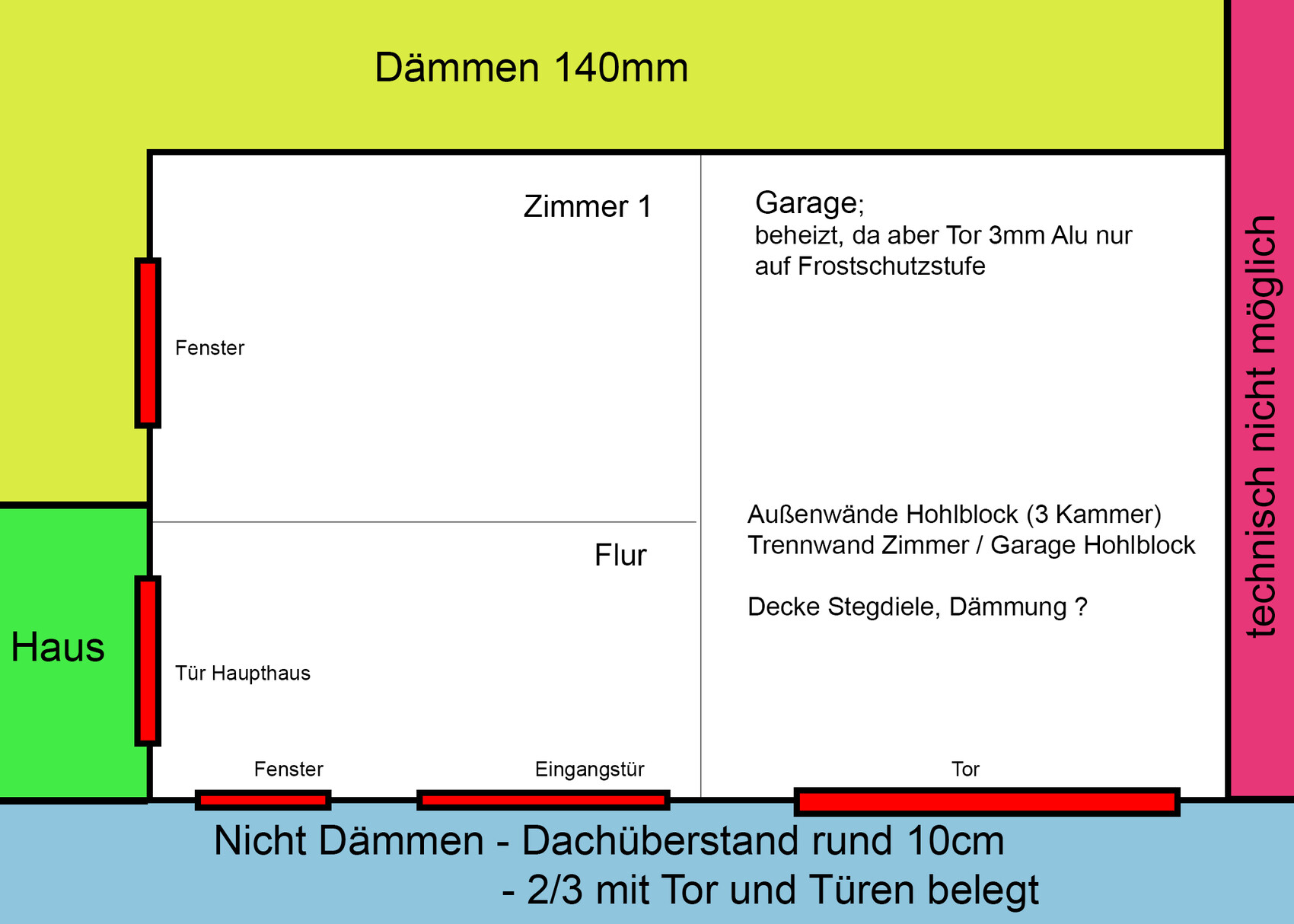 da es sich gerade anbietet, wollten wir den gelb markierten Bereich gerne Dämmen. Es handelt sich um einen Anbau. Als Decke sind Stegdielen verwendet wurden, was drüber kommt kann ich nicht sagen. Deckung ist Aluminium Wellblech.
