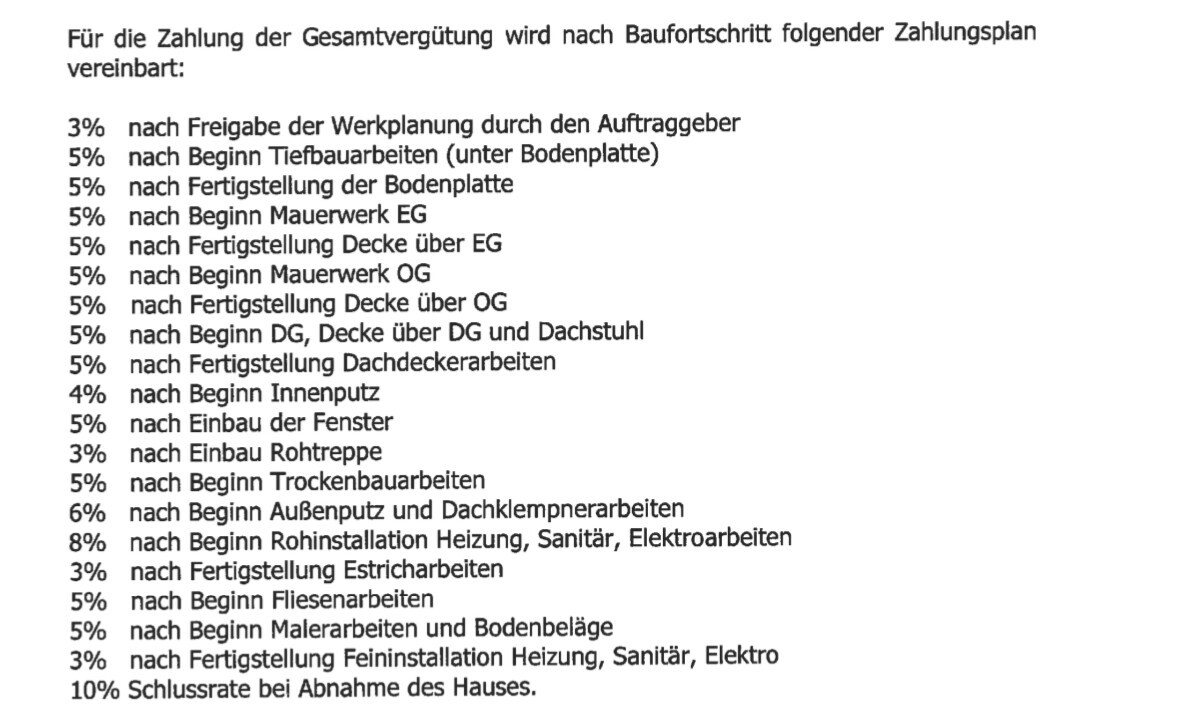 Zahlungsplan anfragen um nicht zu viel in Vorkasse zu gehen. Der Zahlungsplan ist im Anhang