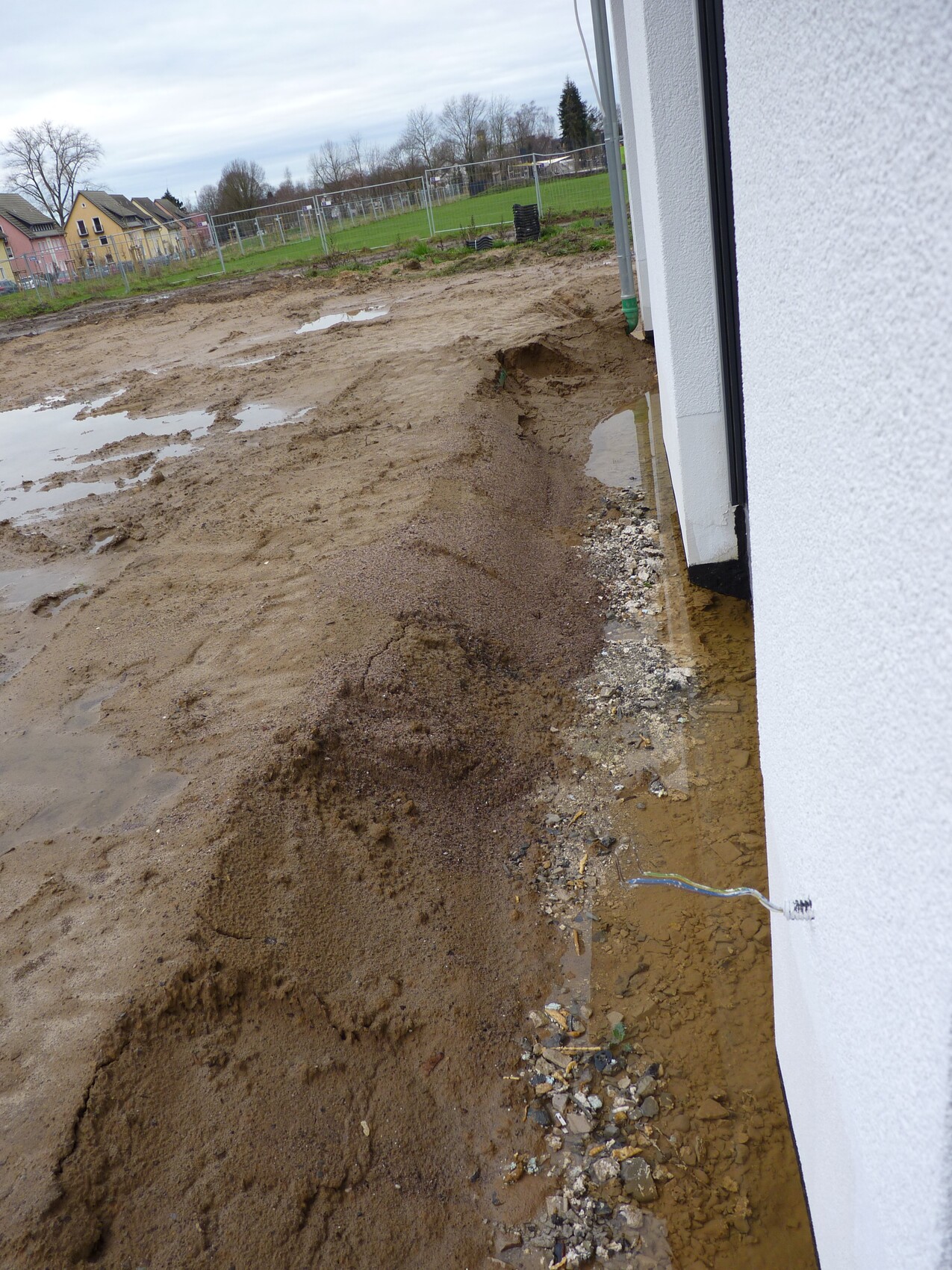 Das geht absolut nicht. du hast stehendes Wasser am Haus, sieh' zu, dass das wegkommt, und zwar nicht "demnächst" sondern heute! Ich hoffe, hier habt mit weißer Wanne gebaut, sonst hast du ein echtes Problem. Das ist ein Haus, kein Boot! Und falls es ein Holzständerhaus ist, dann Helm ab zum Gebet...