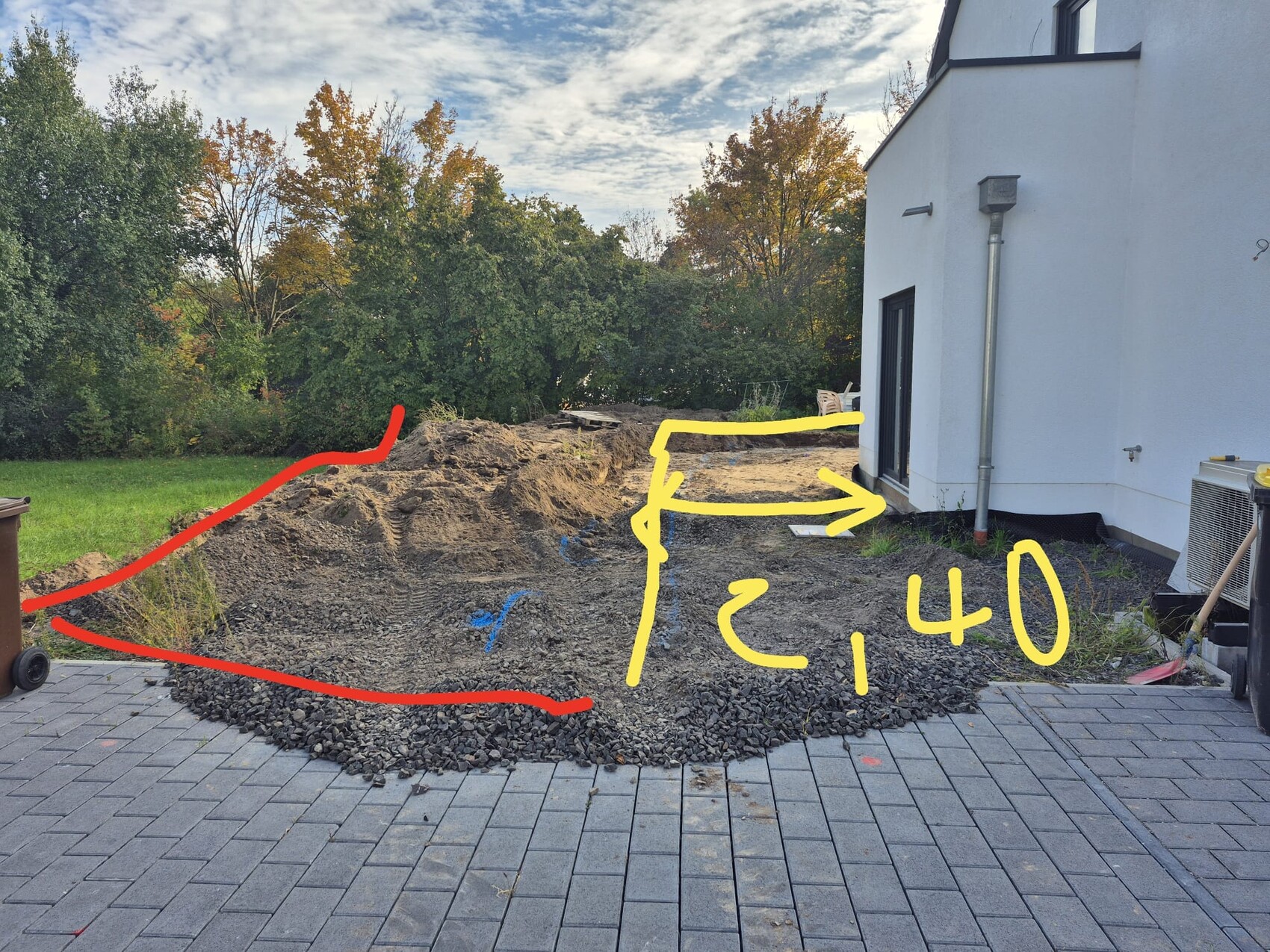 heute war ein Bagger da, er hat die Erde abgetragen, wo die Terrasse hinkommt. Etwas grosszügiger, morgen müssen wir den Plan abgeben, wie gross die Terrasse genau werden soll. Das schau ich mir morgen final an im Garten, dann schauen wir.