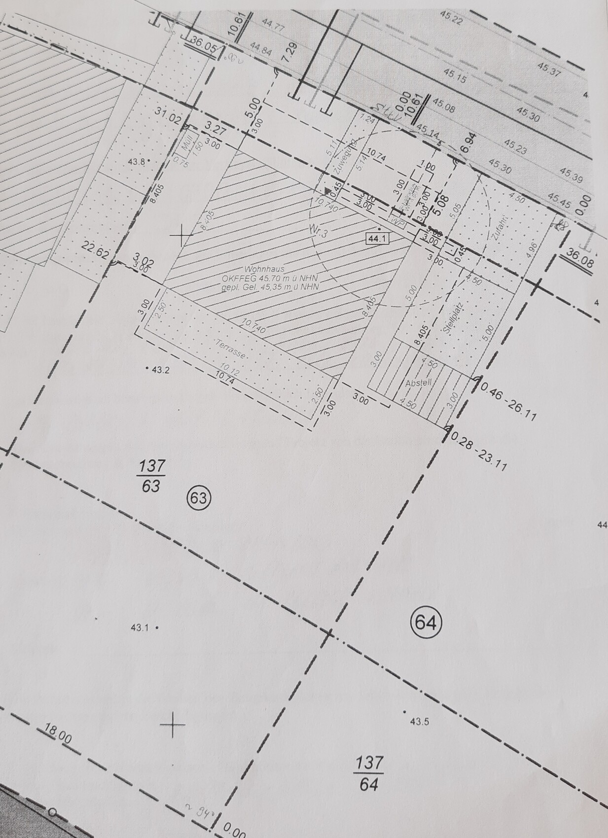 Die 43,2 m des Höhenpunktes südlich der Terrasse stimmen nicht mehr, wir haben den Garten mit unserem Aushub auffüllen lassen, das waren so 50-80 cm.
