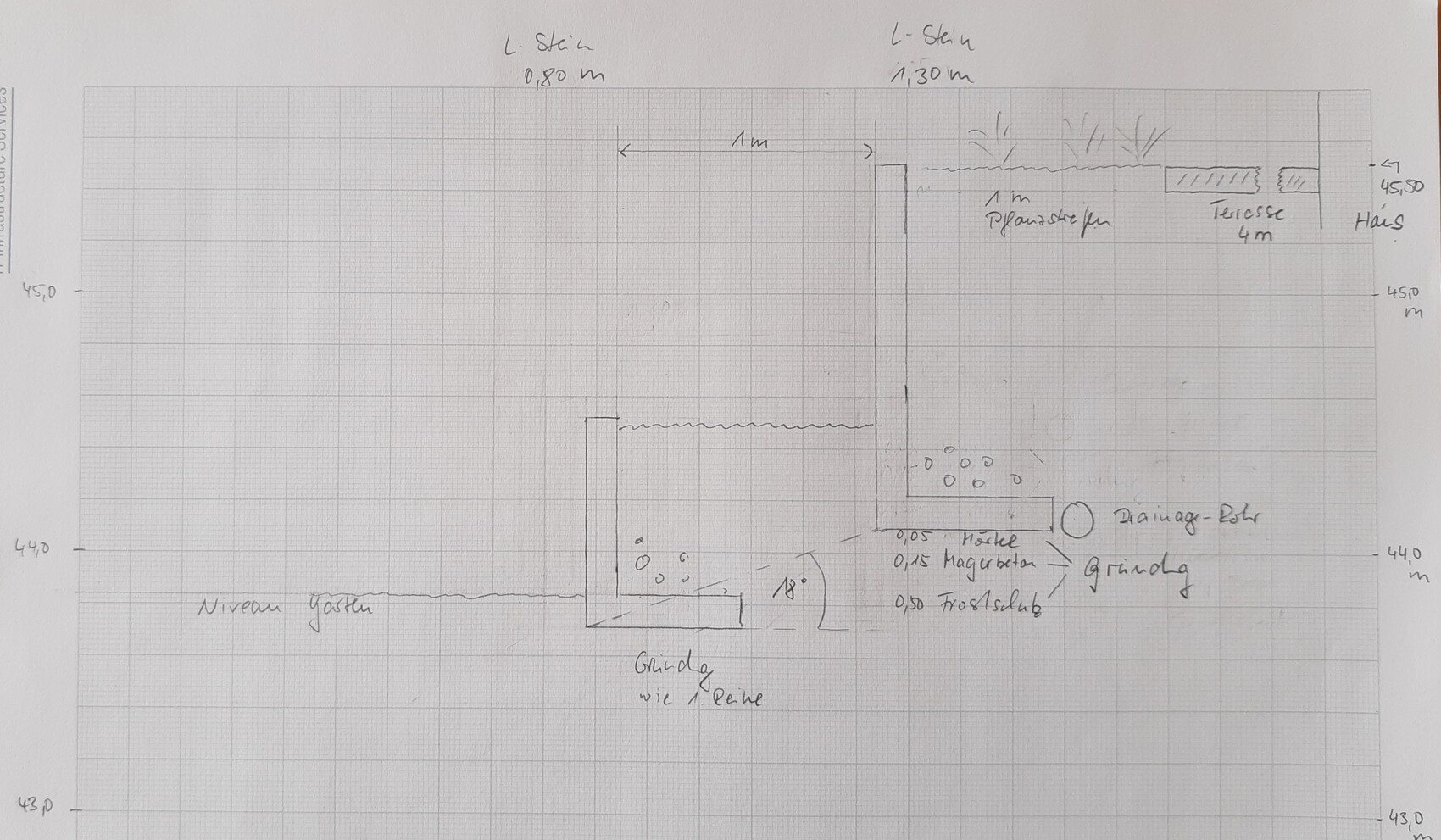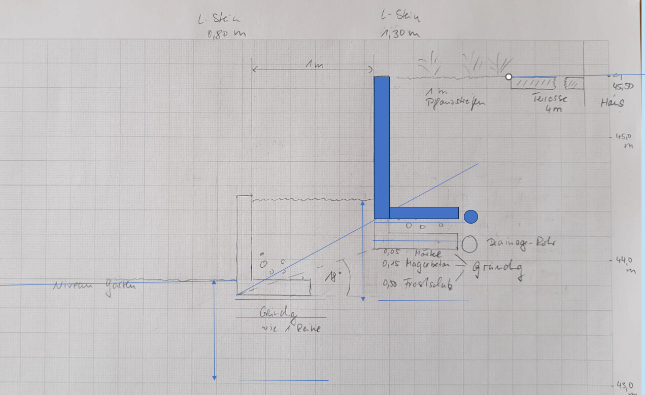 Garten und Terrasse sollten 1-2 % Gefälle haben vom Haus weg. Damit kommst mit einige cm kleineren L-Steinen aus. Oben dann vermutlich eher 1 m hohe Steine und unten 0,8 m Steine. Zeichne das Dir nochmals genau auf.