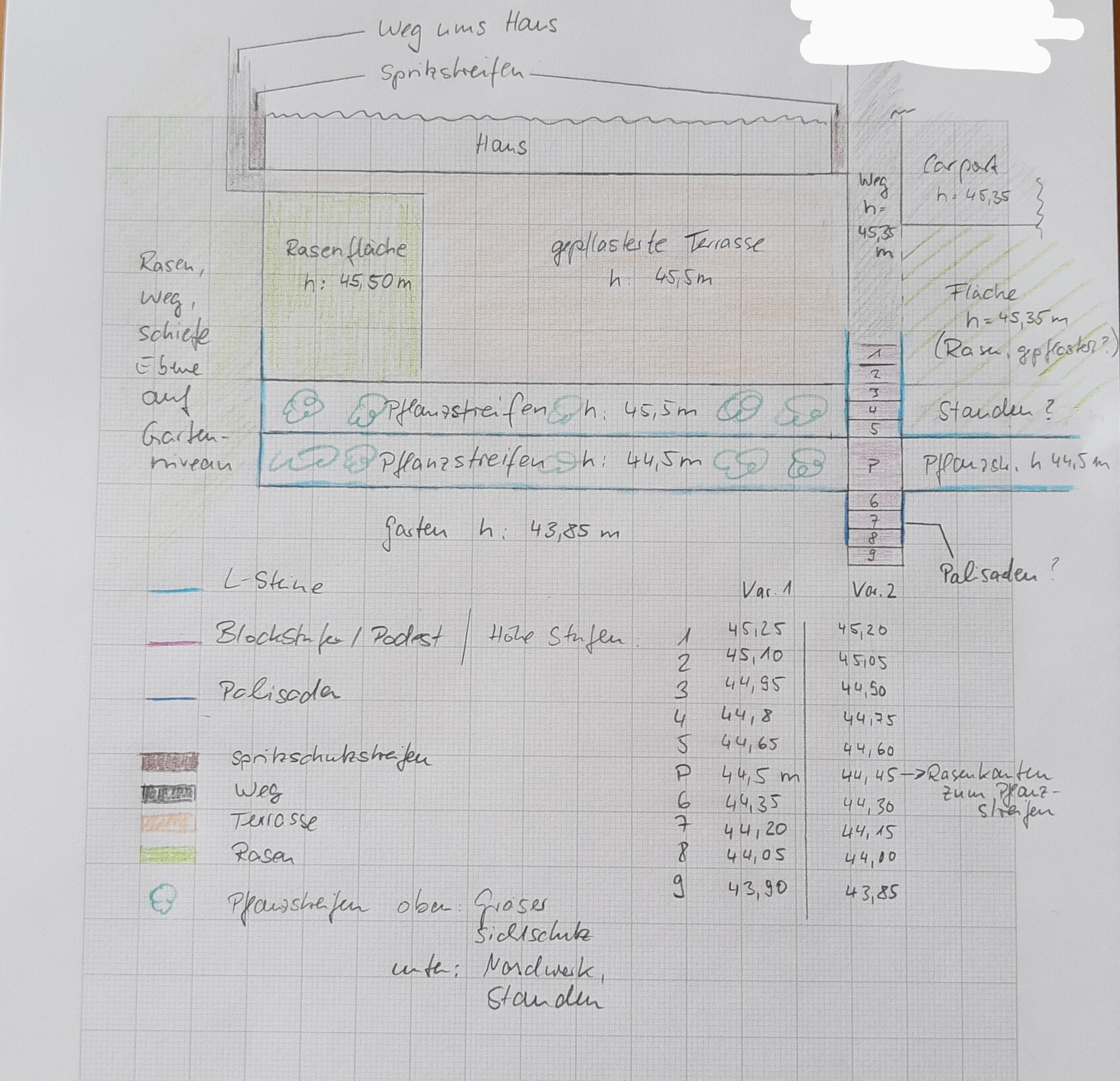Planlinks die schiefe Ebene ist vorgesehen, um auch mal mit Schubkarre etc. von der Strasse aus in den Garten zu kommen. Unsere Nachbarn planlinks haben es so realisiert, wir führen das weiter, damit wir zu ihnen nicht abfangen müssen. Wie genau diese Steigung dann verläuft und wie sie befestigt wird, wie weit sie in den Garten ausläuft... bedarf noch genauerer Planung.