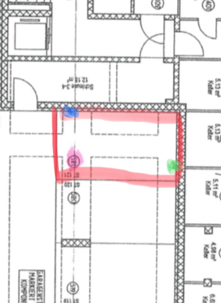 Macht das aus Eurer Sicht Sinn oder sollte man die Wallbox besser auch an die kurze Wand (wo der grüne Punkt ist) legen?Gute Frage. Leider kennen wir die Größe des Stellplatzes nicht, dann wäre es einfacher zu sagen.Ich würde aber lieber Einschränkungen in der Länge als in der Breite bevorzugen. Somit Wallbox + Steckdose am grünen Punkt. Hängt aber auch davon ab, wo der Stecker am Auto ist...