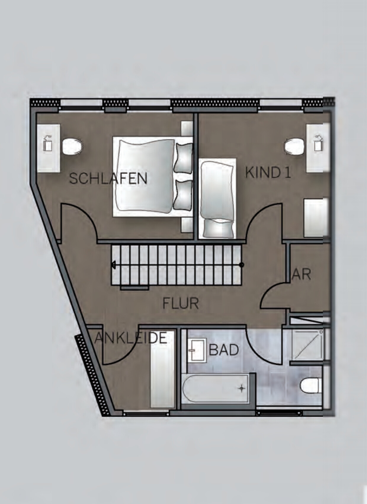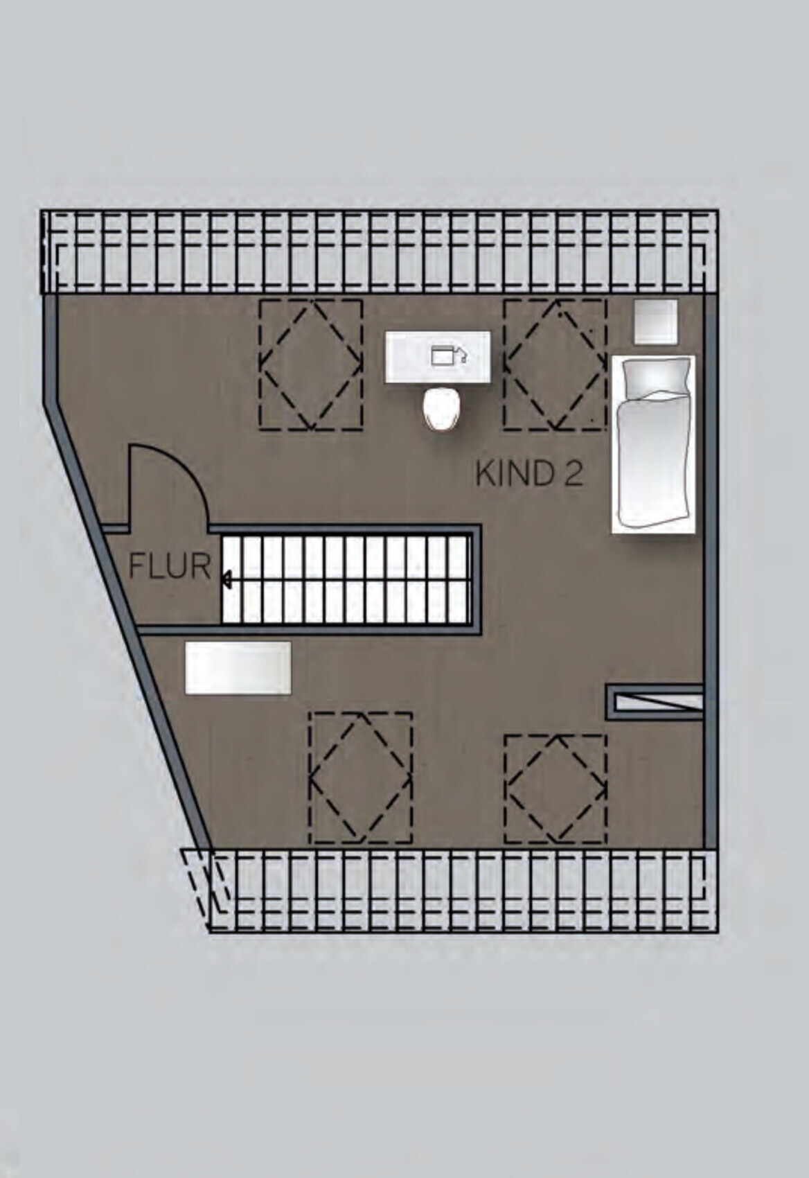Wir sind aber mit dem Projektleiter im Gespräch, dass wir aus dem Dachgeschoss 2 Räume machen, jedoch gibt es hier das Problem mit der schrägen Wand und einer Tür. Die Treppenanlage kann man nicht drehen, wie zuerst gedacht, da wir sonst vor einen Träger laufen.