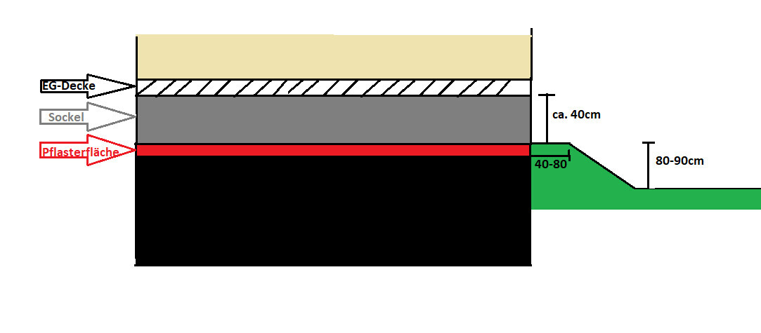 Querschnitt einer Terrasse mit Pflasterfläche neben dem Gebäude, Sockel und EG-Decke sichtbar