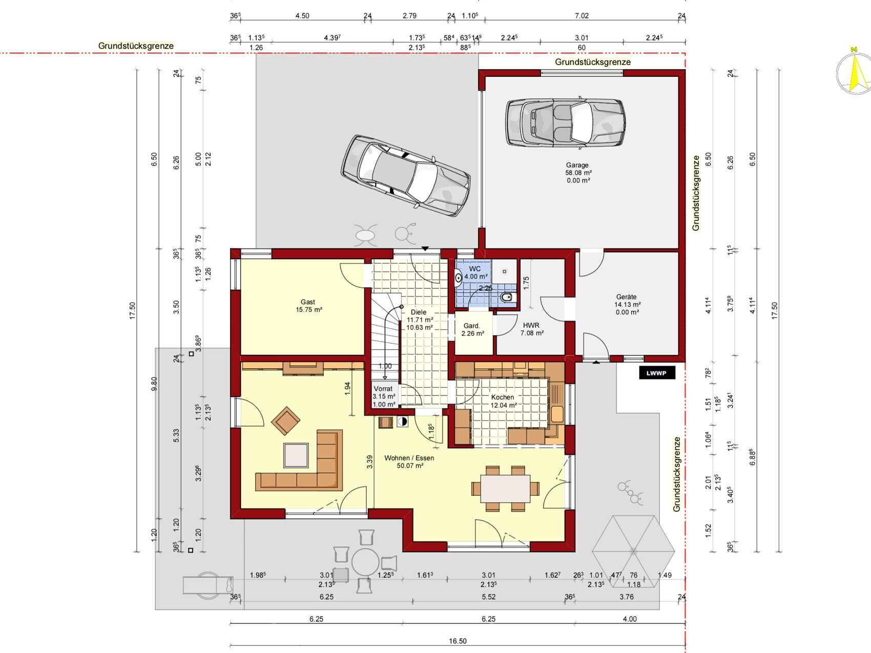 Und ein Eingangsbereich in der Außenanlage fehlt völlig. Da würde ich das Haus von der Garage lösen bzw. diese einen halben Meter breiter bzw das Tor nicht mittig setzen, sodass am Eingang ein ordentliches Podest Platz hat.