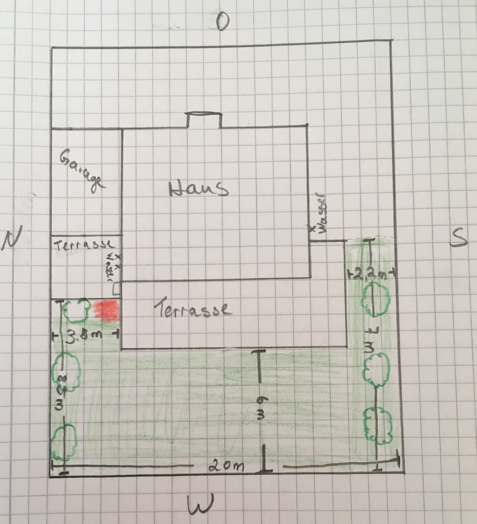 Dort wo ich im Plan den roten Fleck gemacht habe, möchte ich den Wasserverteiler, einen Stromverteiler und die Garage für den Roboterrasenmäher hinbauen, ob da am Ende noch nen Pflänzchen Platz hat, wird sich zeigen