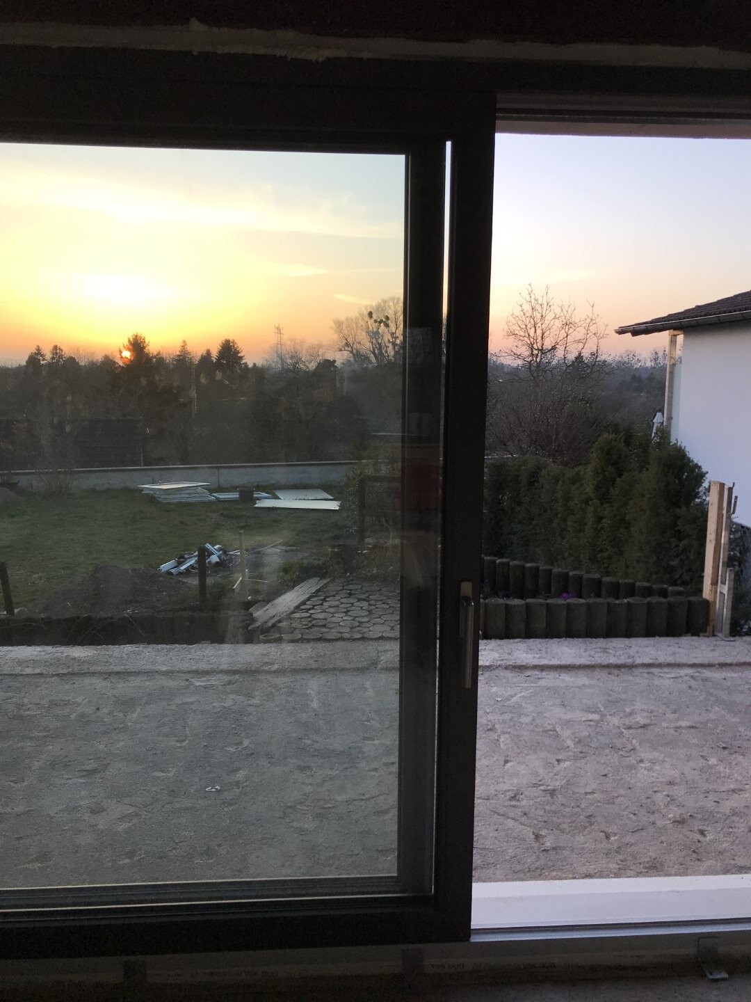 Sonnenuntergang über dem Garten, Blick durch Glas-Schiebetür auf Hof mit Holzstapeln