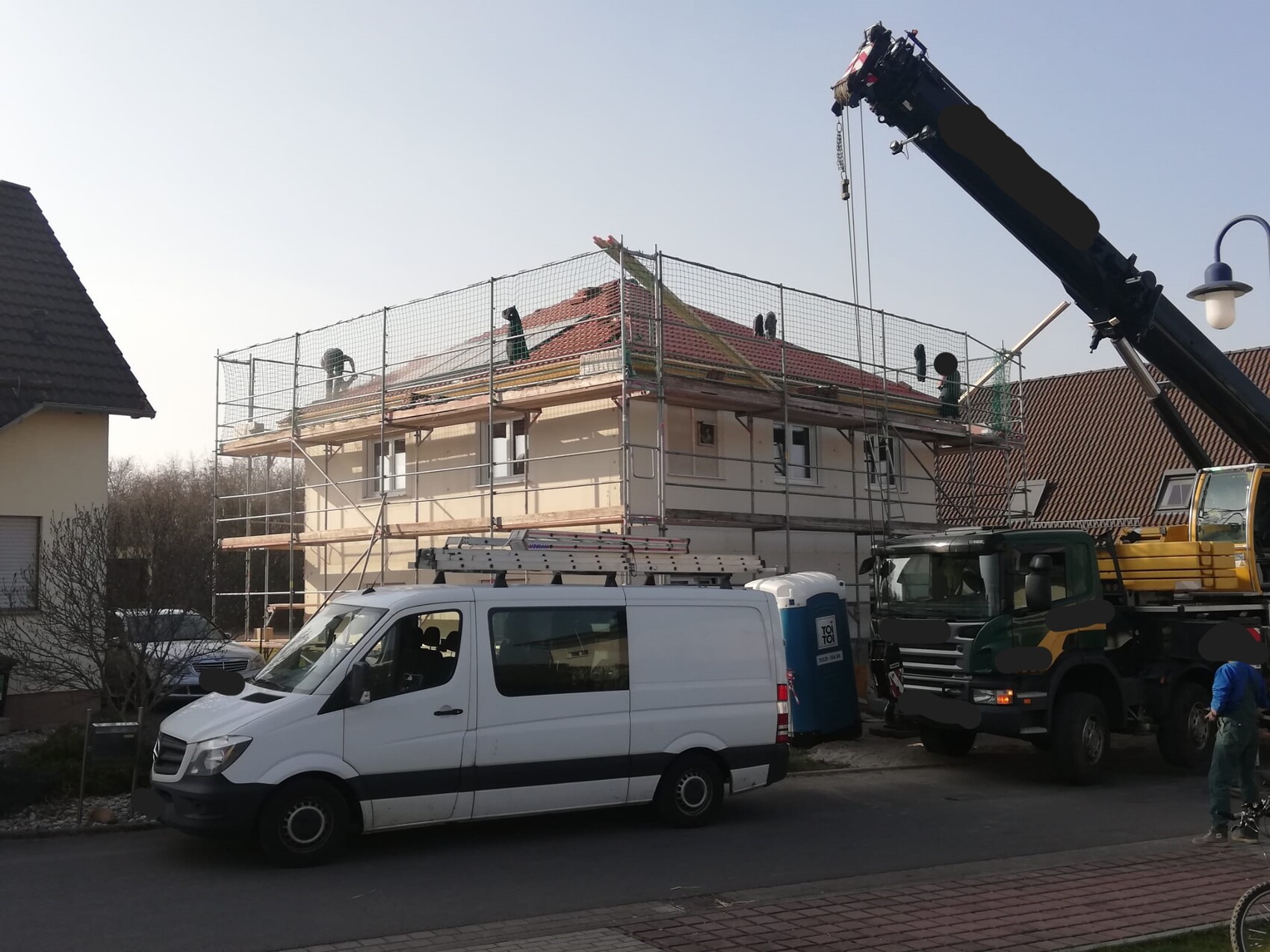 Einfamilienhaus mit Gerüst, Dacharbeiten, Kran und Baufahrzeugen auf der Baustelle