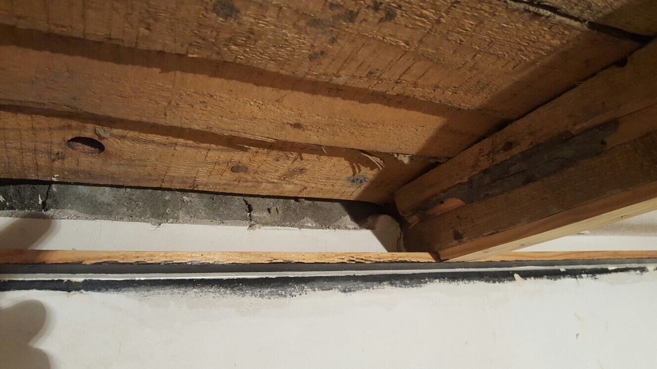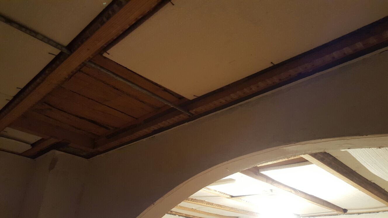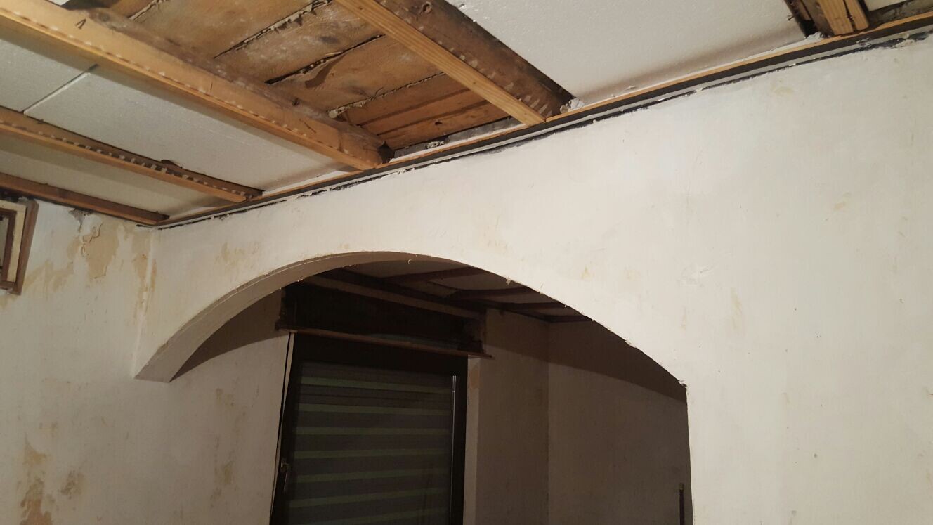 Innenraum mit freigelegten Holzbalken, Bogenöffnung und beschädigten Wänden.