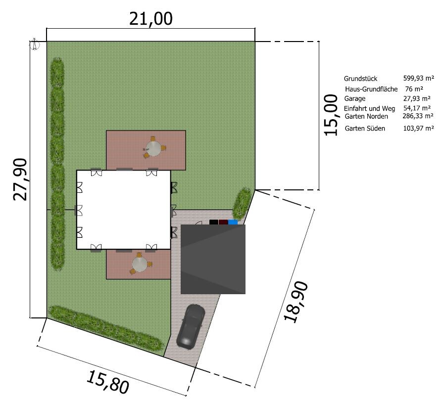 - Ich habe in einem eigenen Vorschlag das Haus mit Garage 4m nach Norden gestellt, dadurch wäre Nord- und Südgarten eher 50/50 verteilt. Findet ihr das besser/schlechter? Ich habe herausgehört, dass einen gleichmäßige Verteilung des Garten nicht ideal ist, weil ich dann keinen Hauptgarten habe sondern nur zwei kleinere.