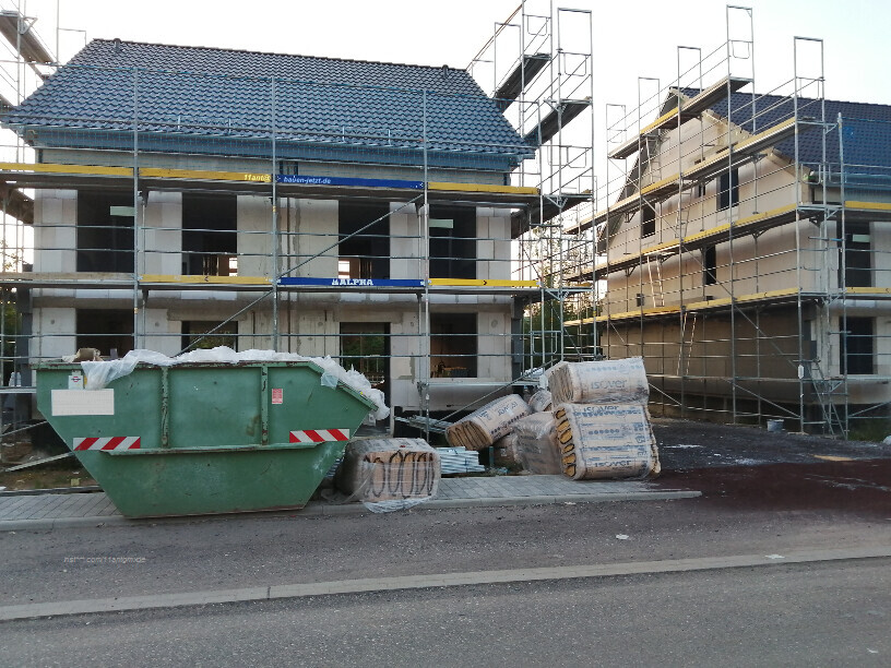 Meine Baufortschritts-Doku der Geschwisterhäuser in NR-Block ist inzwischen beinahe komplett, die dortigen Häuser sind außer daß es ausschließlich Doppelhäuser sind identisch, und es werden bereits die Garagen errichtet. Es gibt übrigens jeweils zwischen Garage und Haus einen Durchgang / Rollweg für Mülltonnen oder Fahrräder.