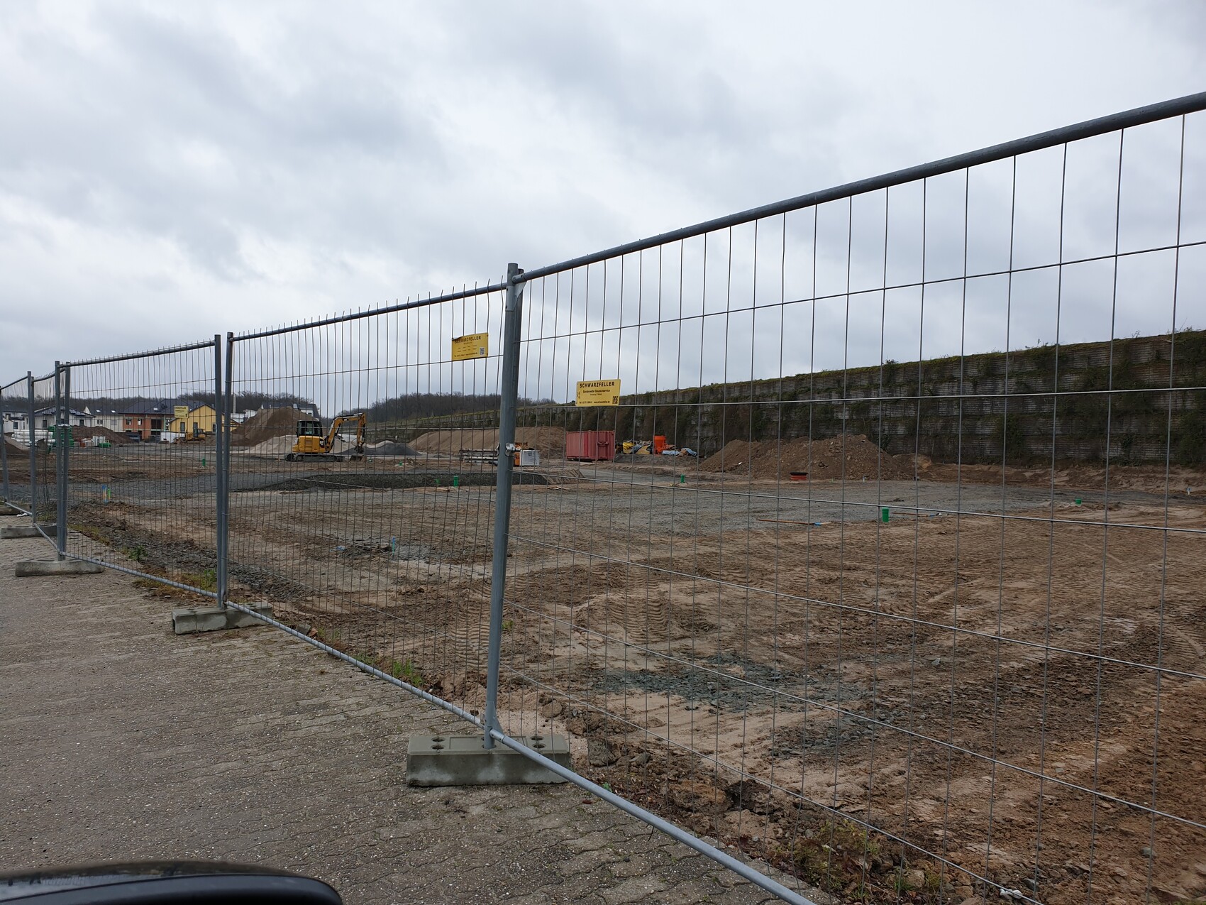 Baustelle hinter einem Metallgitter-Zaun; Bagger, Sandhaufen und bewölkter Himmel.