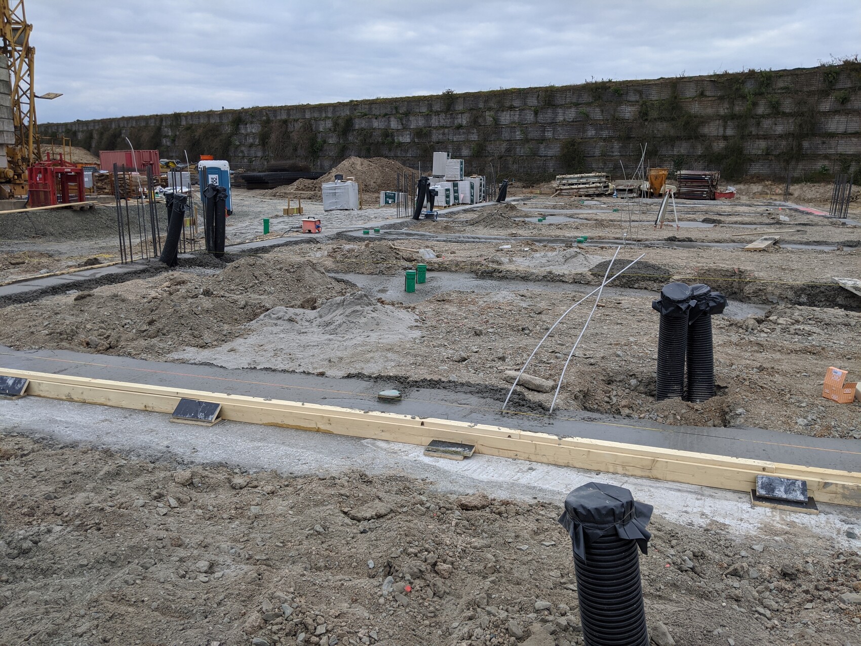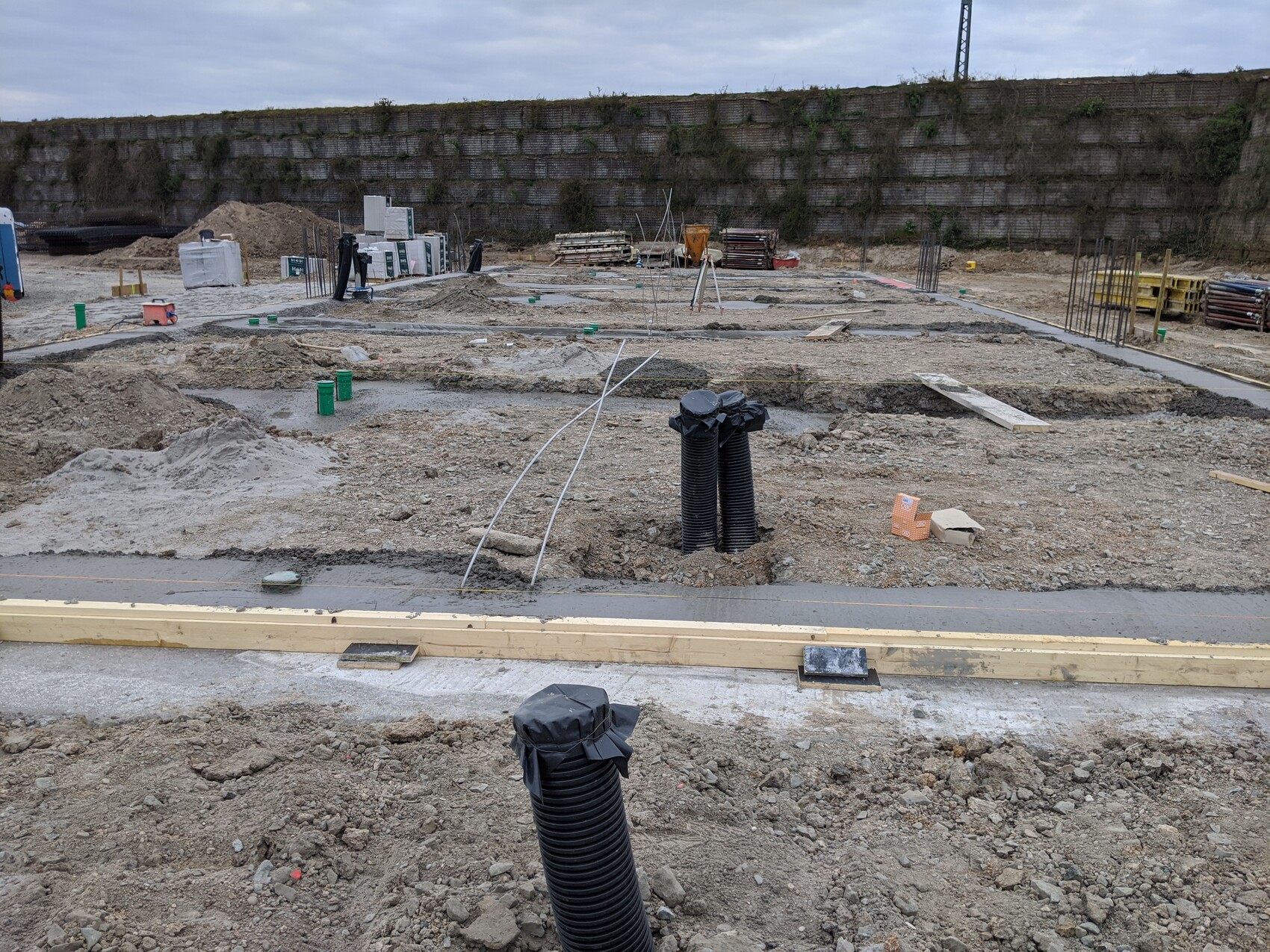 Baustelle mit Gräben, schwarzen Rohren, Holzformen und Baumaterialien, Mauer im Hintergrund.