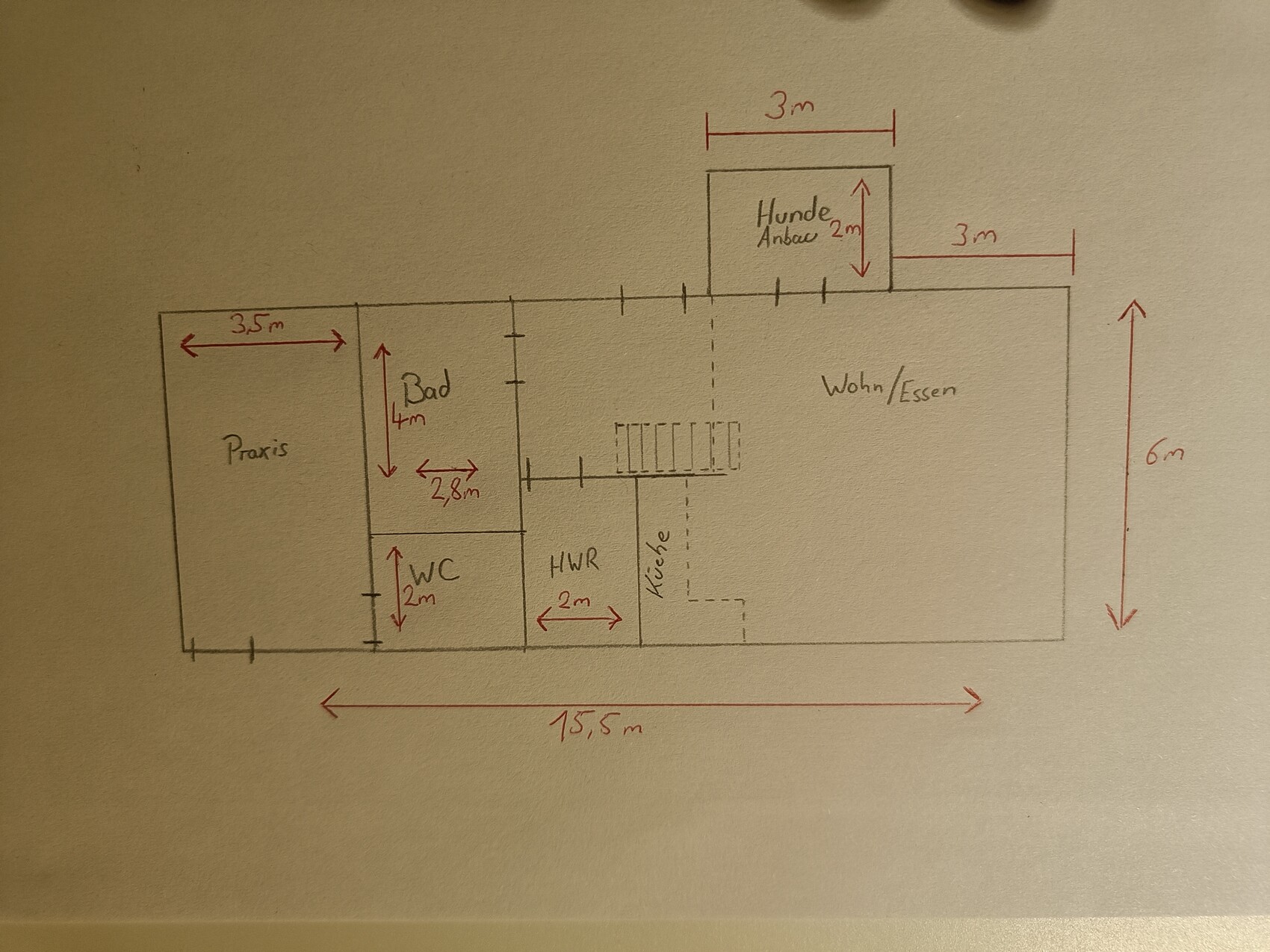 Die Wand zwischen Küche und Treppe werden wir auf 3m verlängern. Die Praxis bitte ignorieren da diese nicht zum Haupthaus gehört.