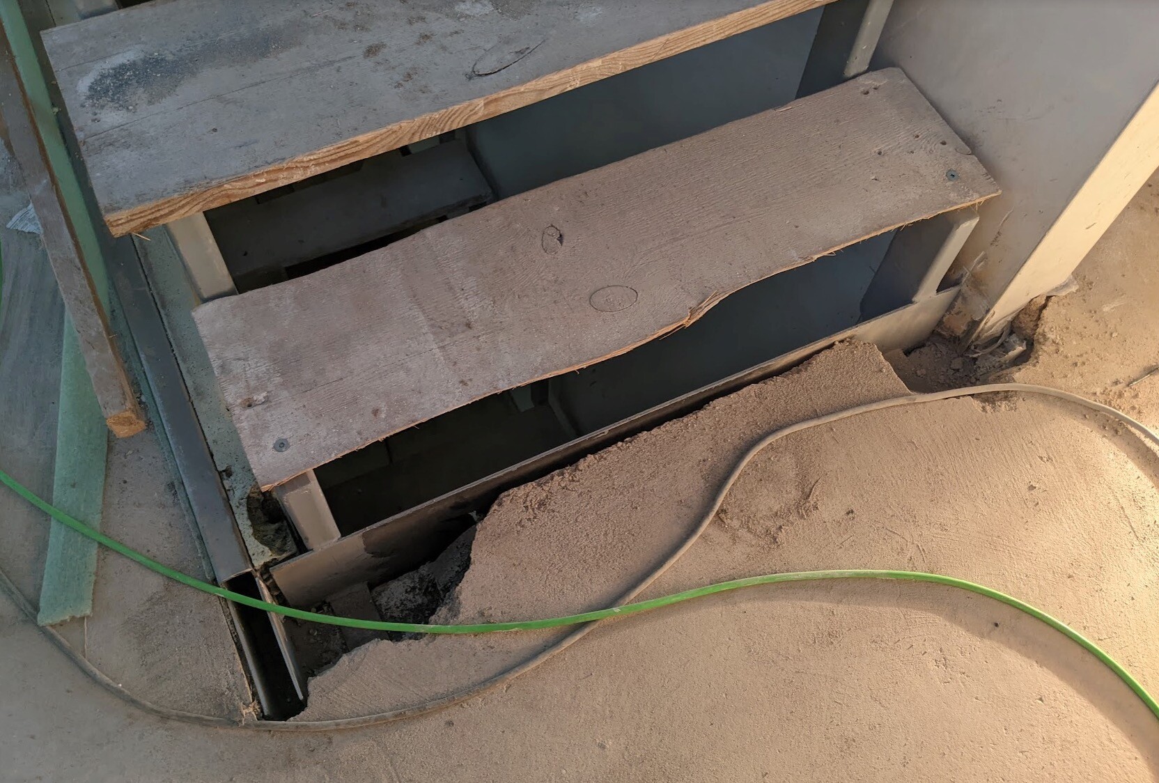 Oben wird die Treppe gekürzt, unten wird die Treppe mit einer Platte versehen und wieder befestigt.