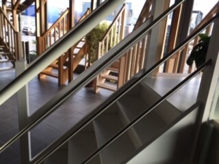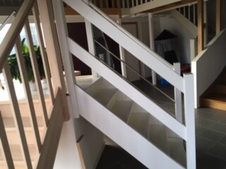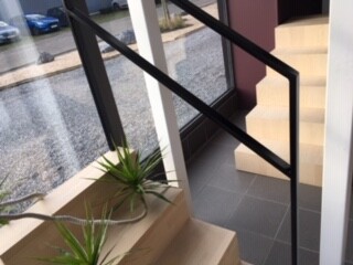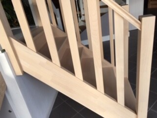 Standard im Preis sind nur Buche und dann mit horizontalen Serben (wie bei der weissen Treppe) und vertikalen Streben (Bild 2). Ich finde das schwarze Metallgeländer nett. Das gibt es auch mit horizontalen Streben. Leider nur gegen Aufpreis. Auch die Inoxstreben kosten extra. Für das schwarze Geländer müsste die Treppe im Antritt begradigt werden.