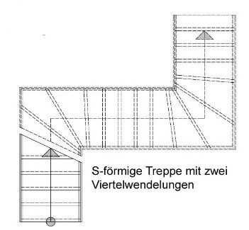 welche Abmessungen müsste denn eine "S-förmige" Treppe mit zwei entgegengesetzten 1/4 Windungen besitzen (siehe Anhang), dass sie "funktioniert". Wir würden uns eine etwas breitere Lauffläche (ca. 115 cm) wünschen. Die Steigungshöhe darf schon bei 19-19,5 cm liegen, das wäre kein Problem.