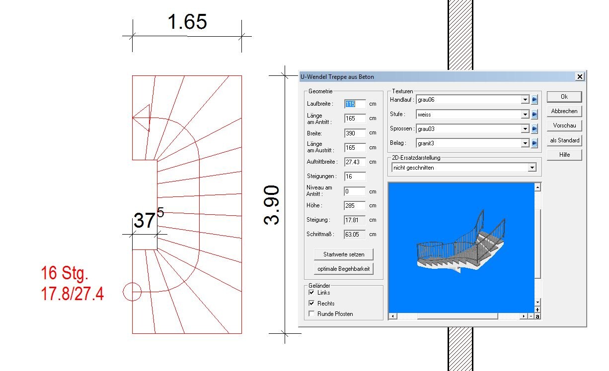 Vielen lieben Dank für deine Mühe! Die Breite würde passen. Eine Laufbreite von 110cm wären auch völlig OK. Mit 17,8/27,4 ist die Treppe sehr bequem Könnte man sich mit 15 Steigungen noch etwas Platz sparen? (Wie viel?) Wie gesagt, es dürfen ruhig 19cm Steigungshöhe sein. Sind wir schon gelaufen und befanden es als nicht störend sondern völlig OK.