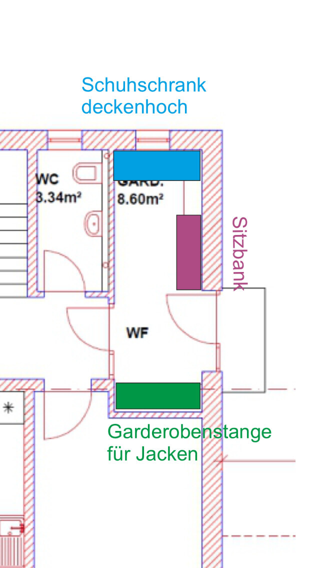 Mein Favorit für die Garderobenmöblierung ist bisher wir in der Anlage skizziert.