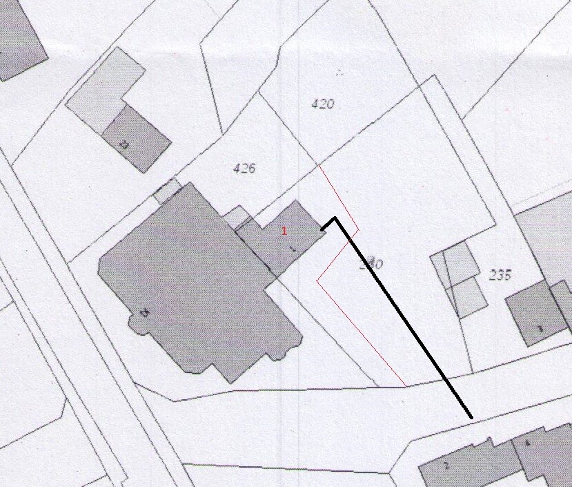 Rote 1 = Haus dessen Leitung durch unser Grundstück läuft. Roter Strich ist die neue Grenze. Uns gehört das Grundstück mit der schlecht lesbaren 280. Schwarz ist die Wasserleitung eingezeichnet.
