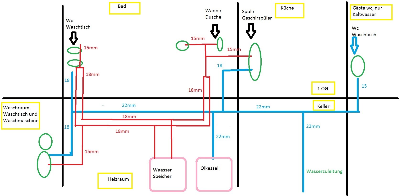 Es ist ein Bungalow. Bad ist unterhalb vom Badezimmer, das heißt ich werde Links und Rechts der Wandentlang die Leitungen hochziehen und dort mit Waschtisch und WC, und auf der anderen Seite Wanne mit Dusche, dann durch die Wand mit Küche- Spüle und Geschirrspüler verbinden. Eigentlich nicht kompliziert, aber wie Groß sollen die Leitungen werden?