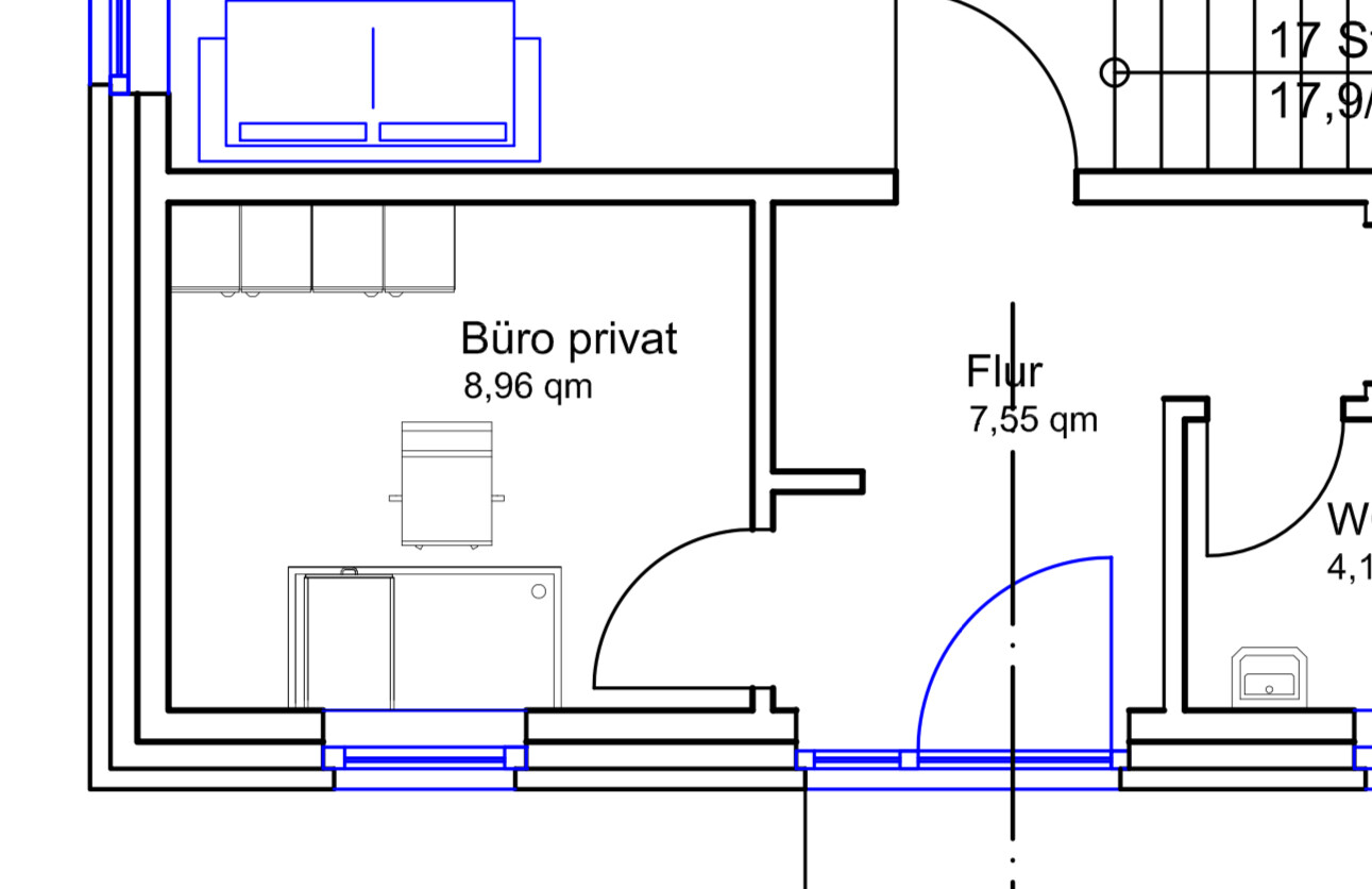 Dabei müssen wir dann nur schauen, ob die Tür versetzt werden sollte oder an der Wand steht. Ein gutes Argument meiner Frau (optisch zumindest) ist, dass die Eingangstür ein Fenster haben soll und man von draußen nicht direkt auf die Büro Tür schauen sollte.