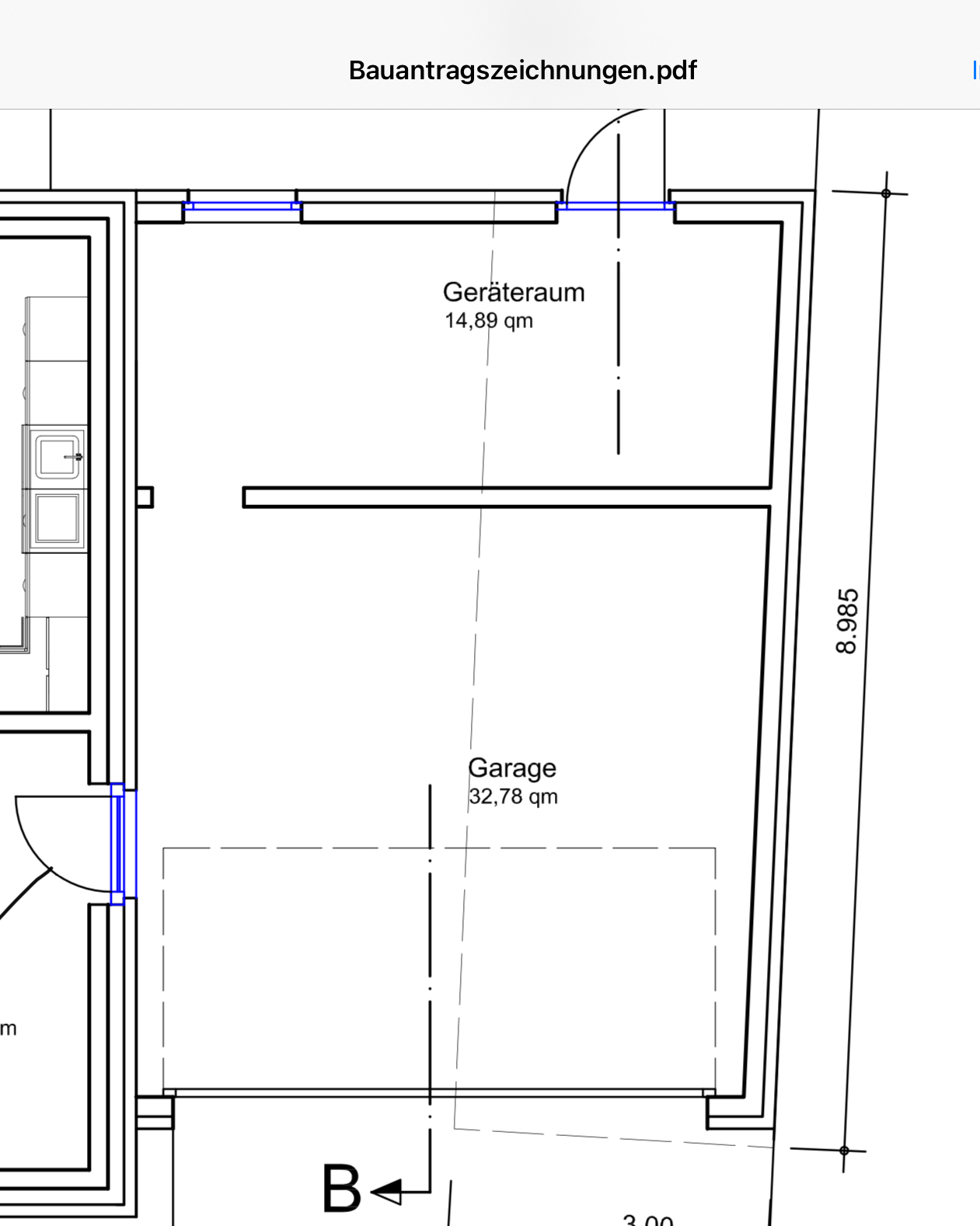 Für den Geräteraum würde ich mir aber überlegen, die Tür und das Fenster zu tauschen und die Tür in Flucht des Durchgangs zur eigentlichen Garage zu legen. Wenn du mir sperrigen Dingen dich da sonst immer durchfädeln musst, geht dir das nach kurzer Zeit sehr auf den Zeiger.